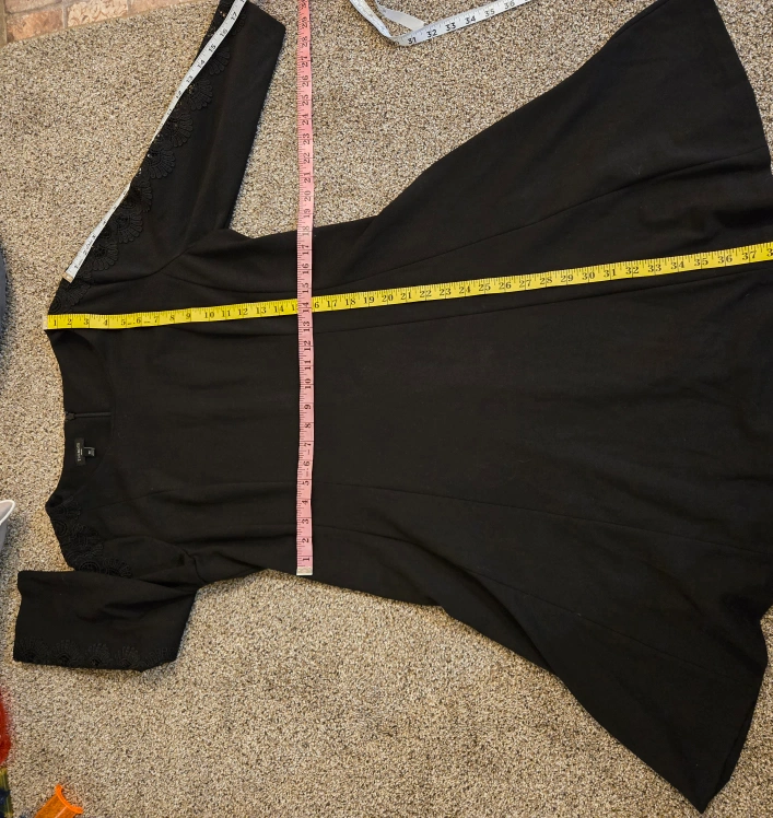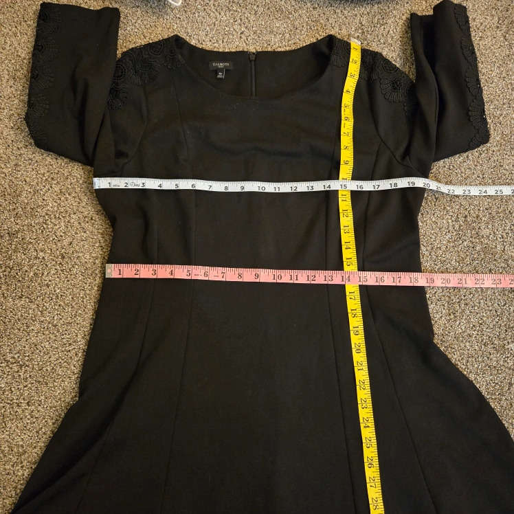 Elevate your wardrobe with this pre-owned solid black A-line dress from Talbots. Designed with a feminine and classic touch, this dress features a round neckline, long sleeves, and a zipper closure. The dress is made from a high-quality polyester blend fabric. Perfect for any occasion, this knee-length dress is suitable for both casual and formal events. This dress is available in size 16 Petite (approximately a size large see pictures for measurements) and is perfect for women of all ages and sizes. Add this dress to your wardrobe today and enjoy a stylish and comfortable look every time you wear it.