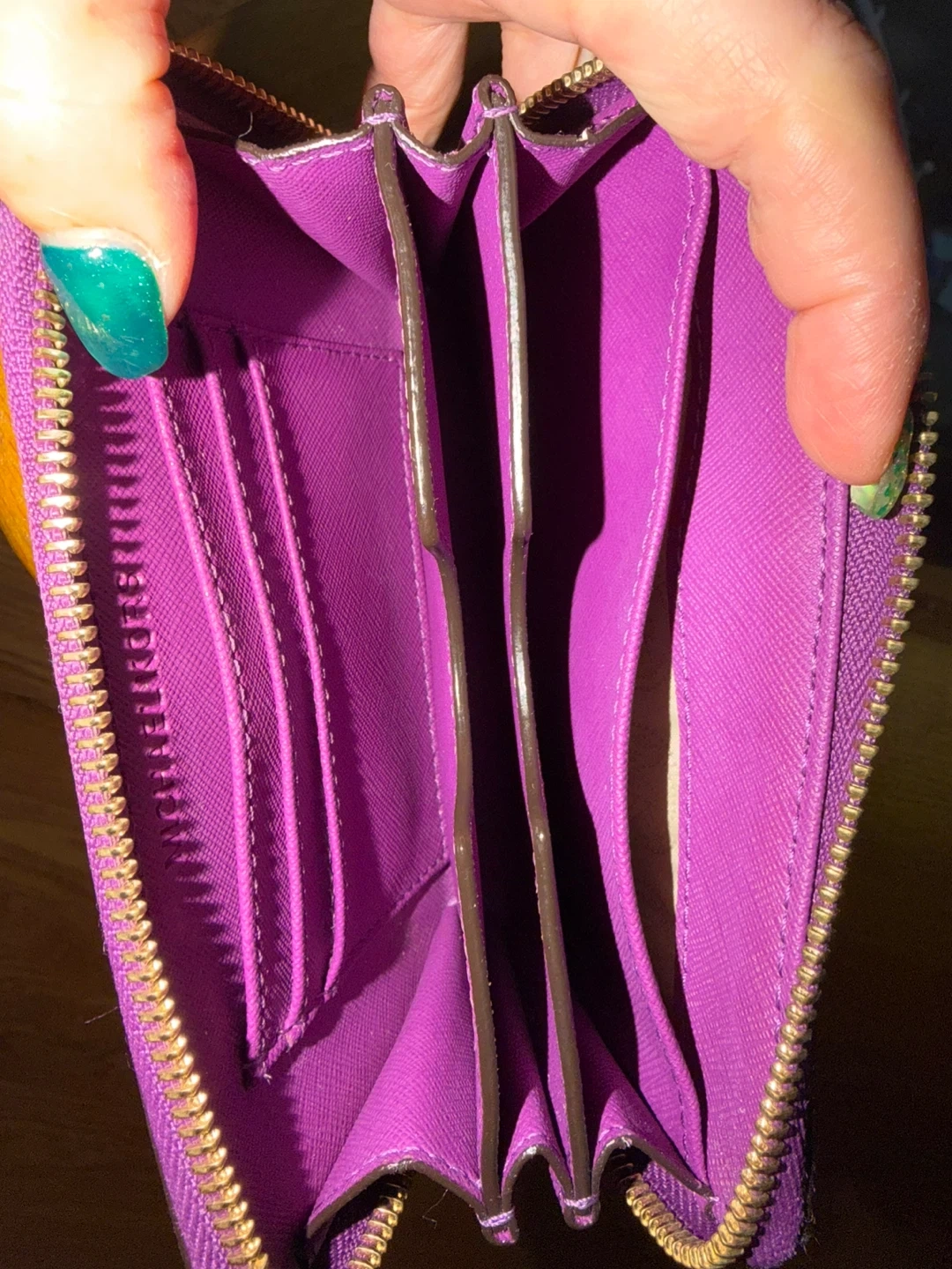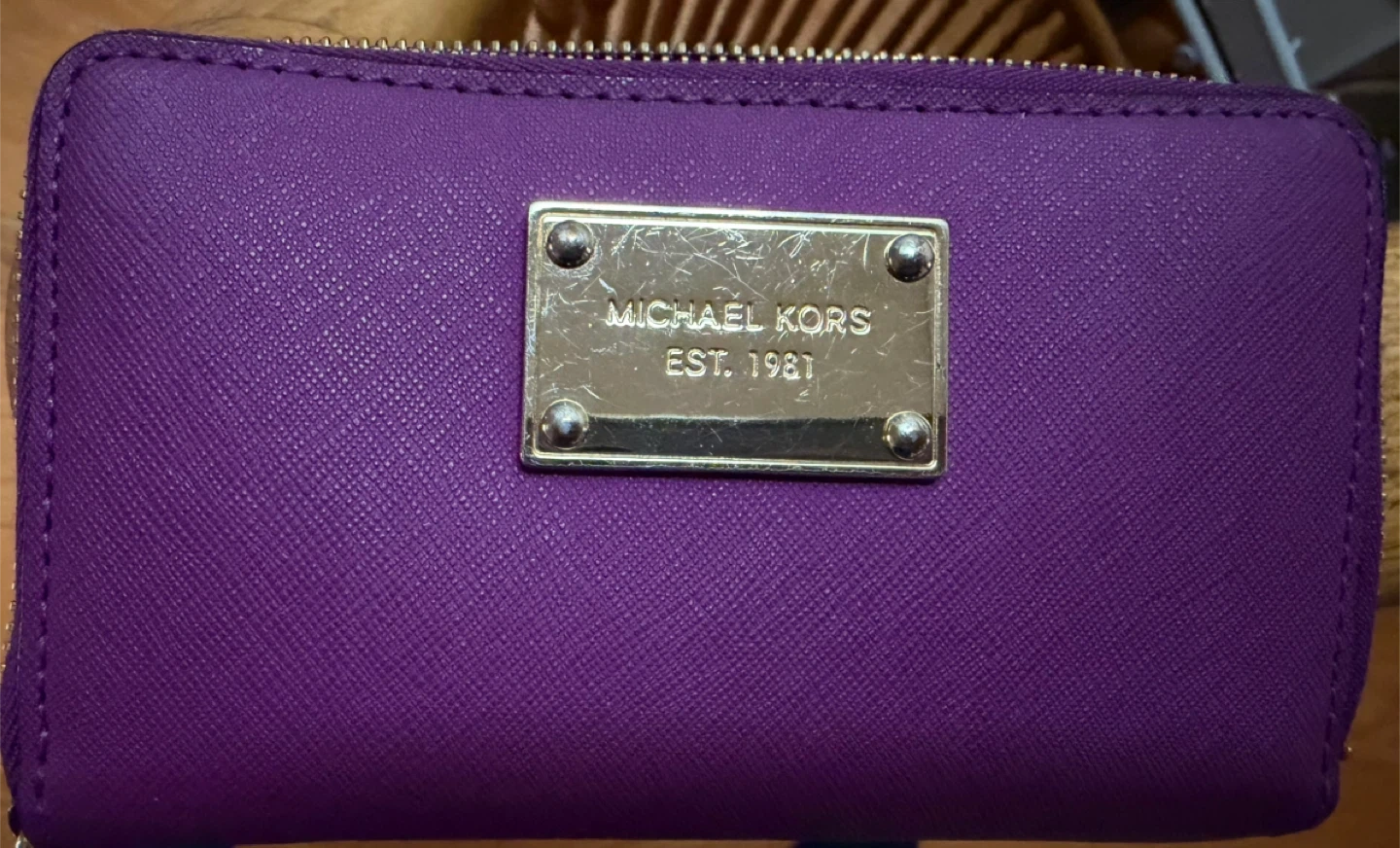 A vibrant purple Michael Kors zipper wallet. It's made from textured leather and has multiple card slots inside. Perfect for organizing your essentials!