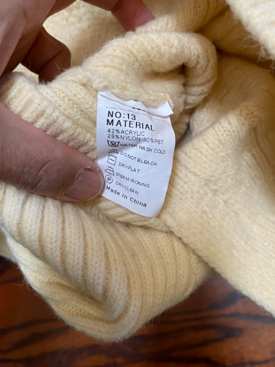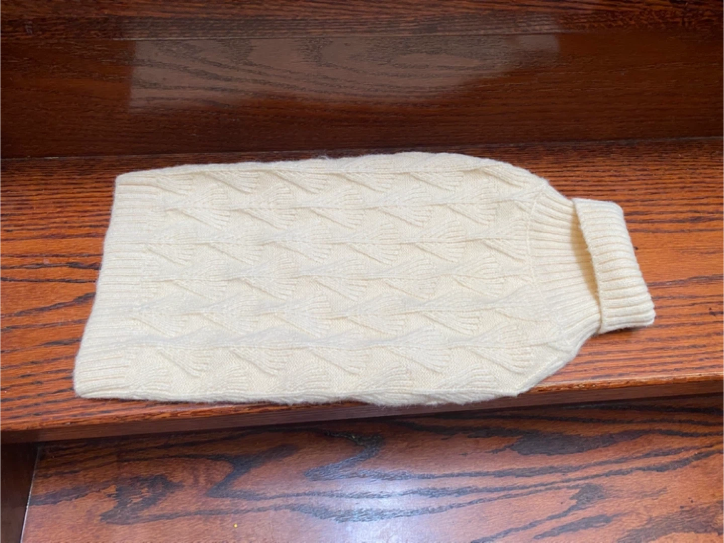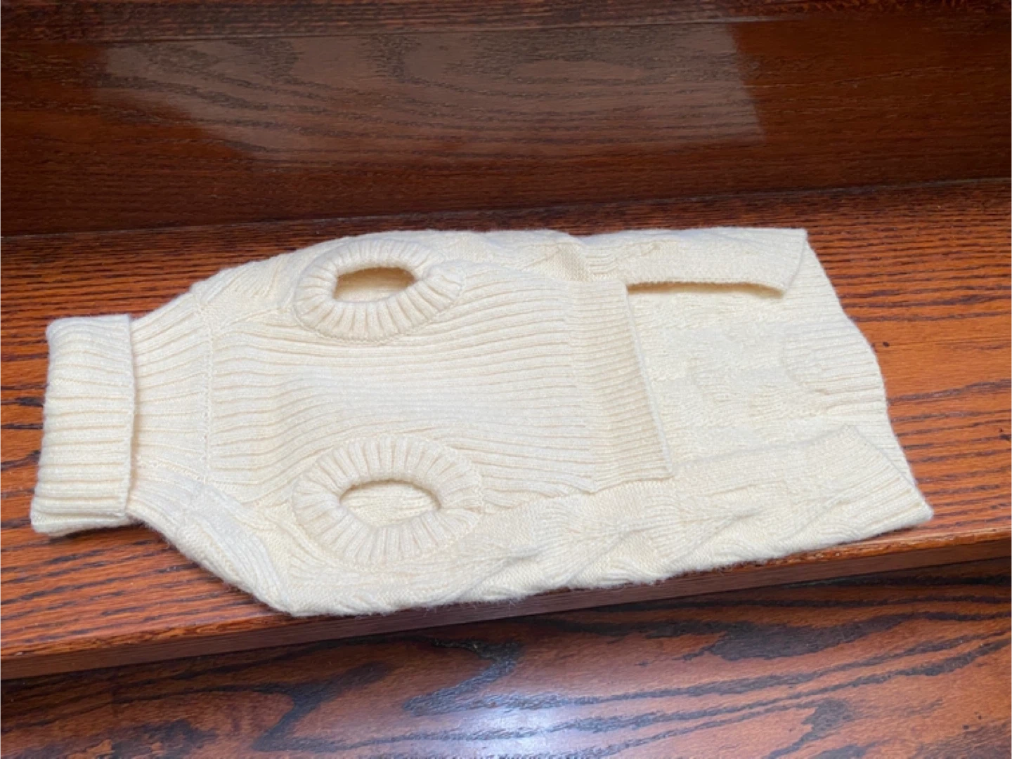 Cream cable knit pet sweater. Made with 47% acrylic, 23% nylon, and 30% PBT. Hand wash cold. Dry flat. Steam ironing or dry clean.
