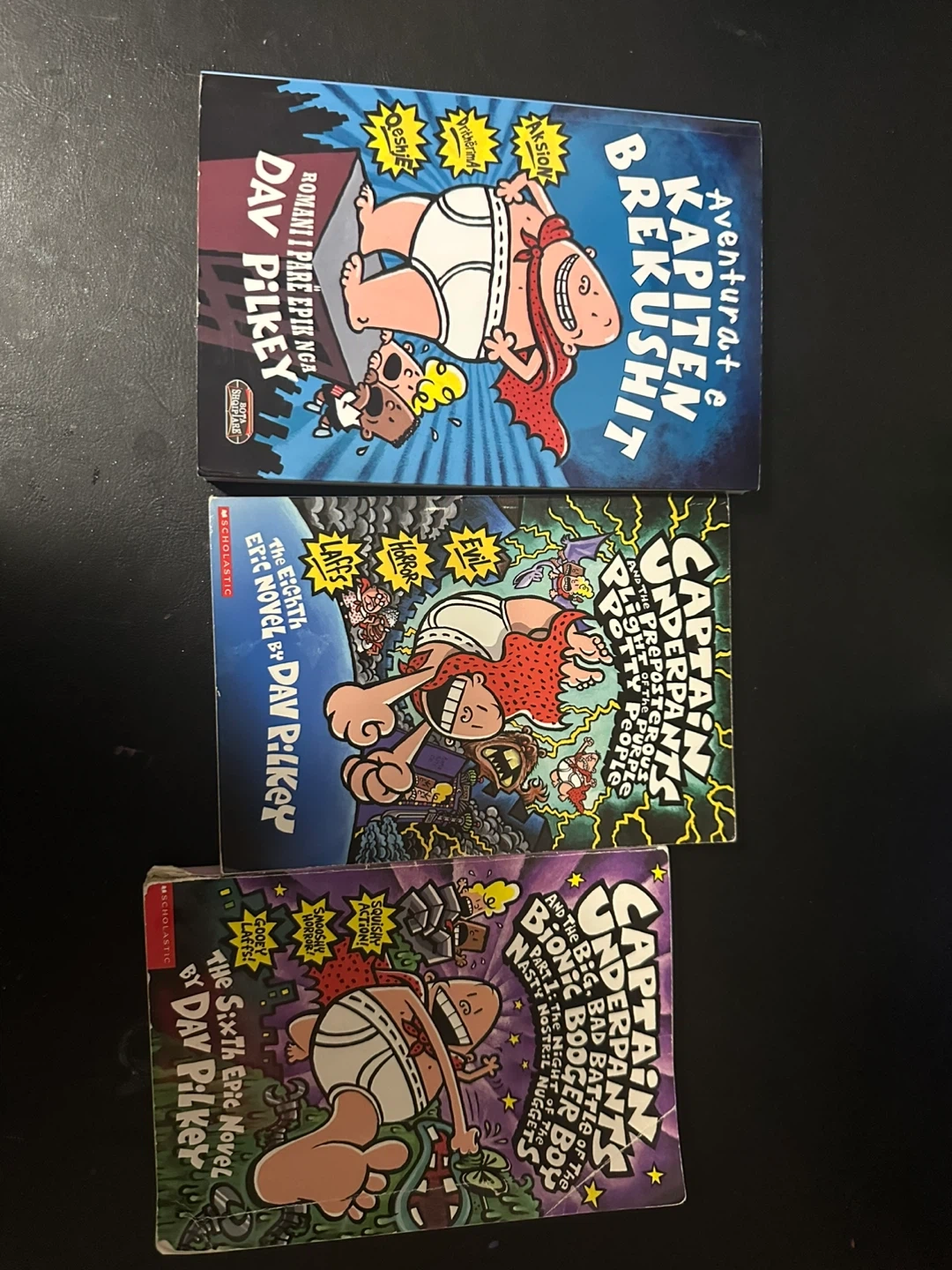 Three Captain Underpants books by Dav Pilkey. Includes 'Aventures of Captain Underpants and the Revolving Revenge of the Radioactive Robo-Boxers', 'Captain Underpants and the Perilous Plot of Professor Poopypants', and 'Captain Underpants and the Big Bad Battle of the Bionic Booger Boy'. These books are great for young readers who enjoy humour and adventure!