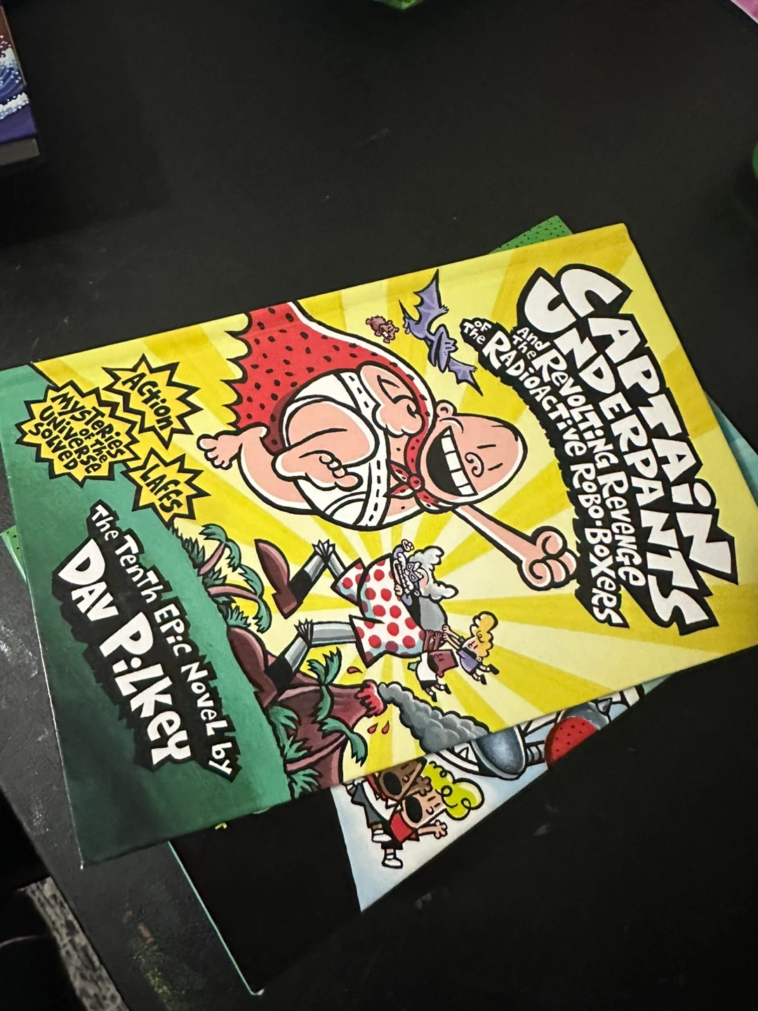 Three Captain Underpants books by Dav Pilkey. Includes 'Aventures of Captain Underpants and the Revolving Revenge of the Radioactive Robo-Boxers', 'Captain Underpants and the Perilous Plot of Professor Poopypants', and 'Captain Underpants and the Big Bad Battle of the Bionic Booger Boy'. These books are great for young readers who enjoy humour and adventure!