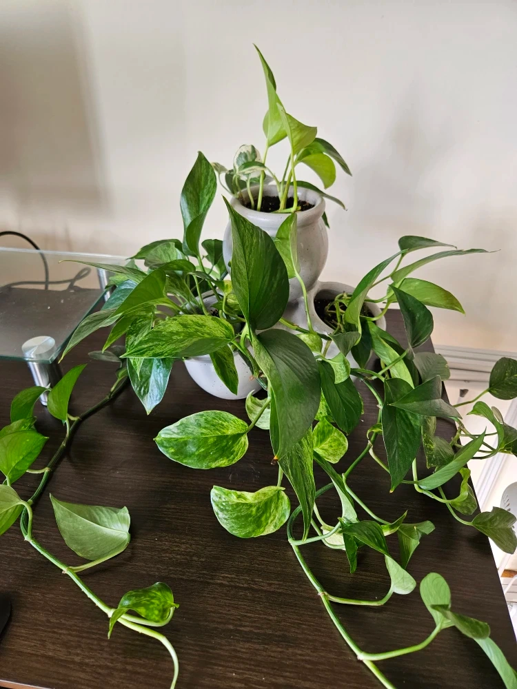 3 other pots have different marble queen pothos bunches that have long hanging growth