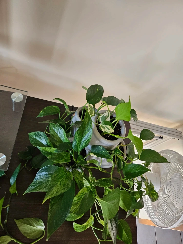 3 other pots have different marble queen pothos bunches that have long hanging growth