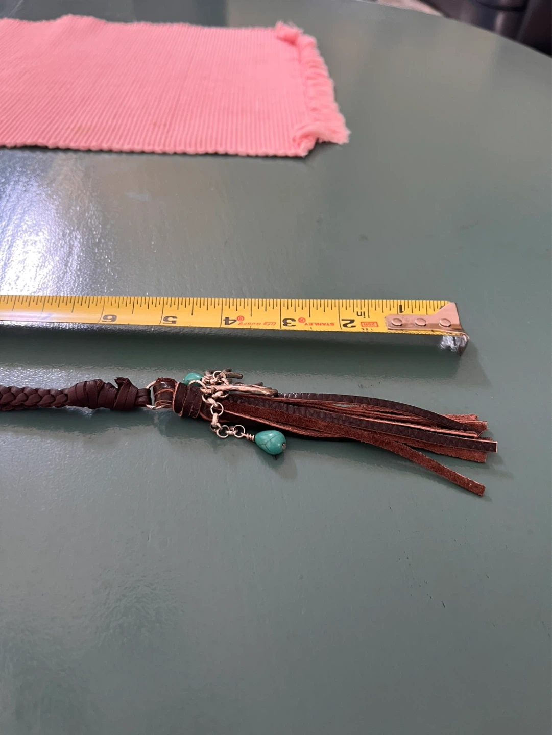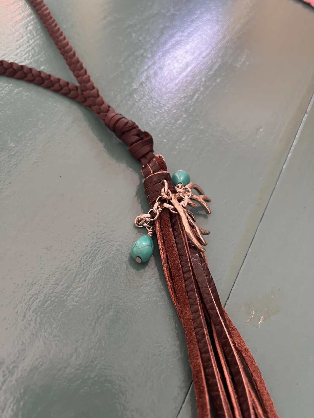 A braided brown leather necklace featuring a fringe tassel with turquoise beads and silver-toned charms. The necklace has a unique, bohemian style. Great for adding a touch of flair to an outfit!
