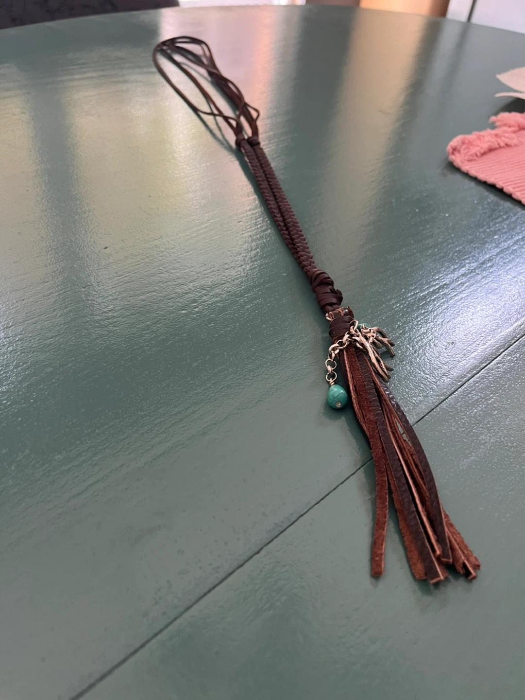 A braided brown leather necklace featuring a fringe tassel with turquoise beads and silver-toned charms. The necklace has a unique, bohemian style. Great for adding a touch of flair to an outfit!