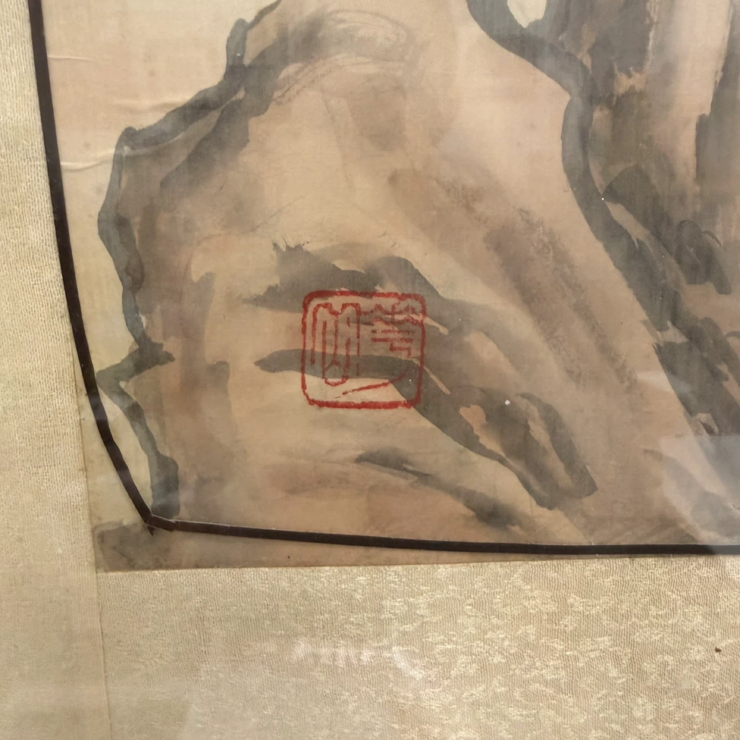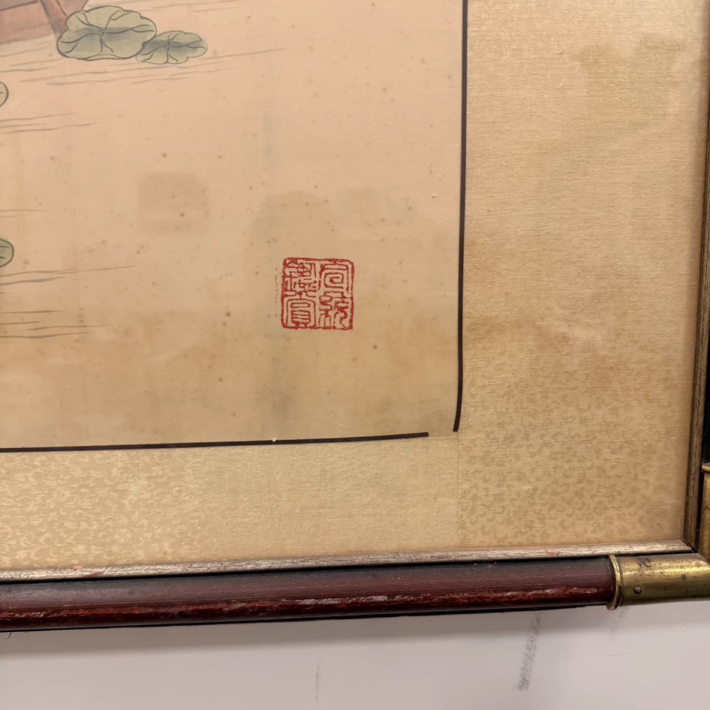 Good vintage condition. Some minor aging and small marks on the silk background consistent with age. Frame and mounting are solid.