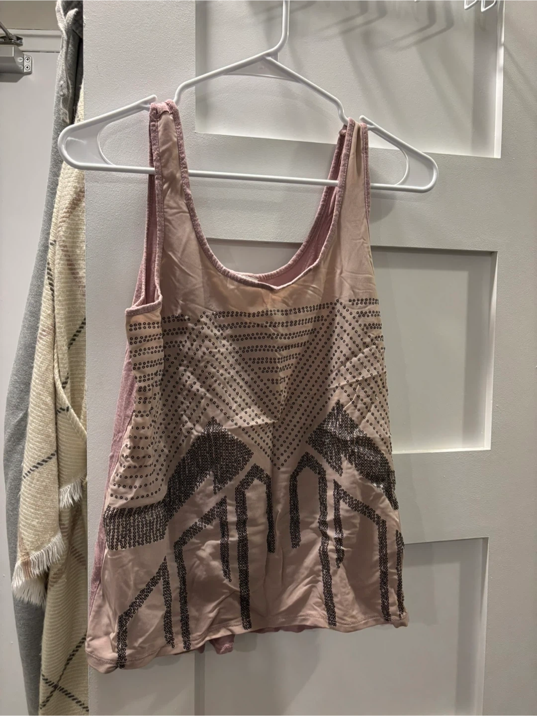 This is a pink tank top with a beaded design across the front. It features a scooped neckline and is made of a light fabric. The beaded pattern is a mix of geometric shapes and vertical lines.