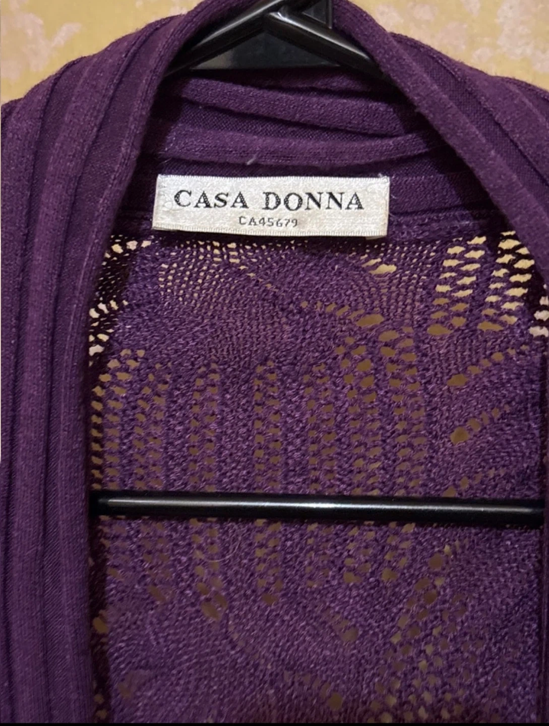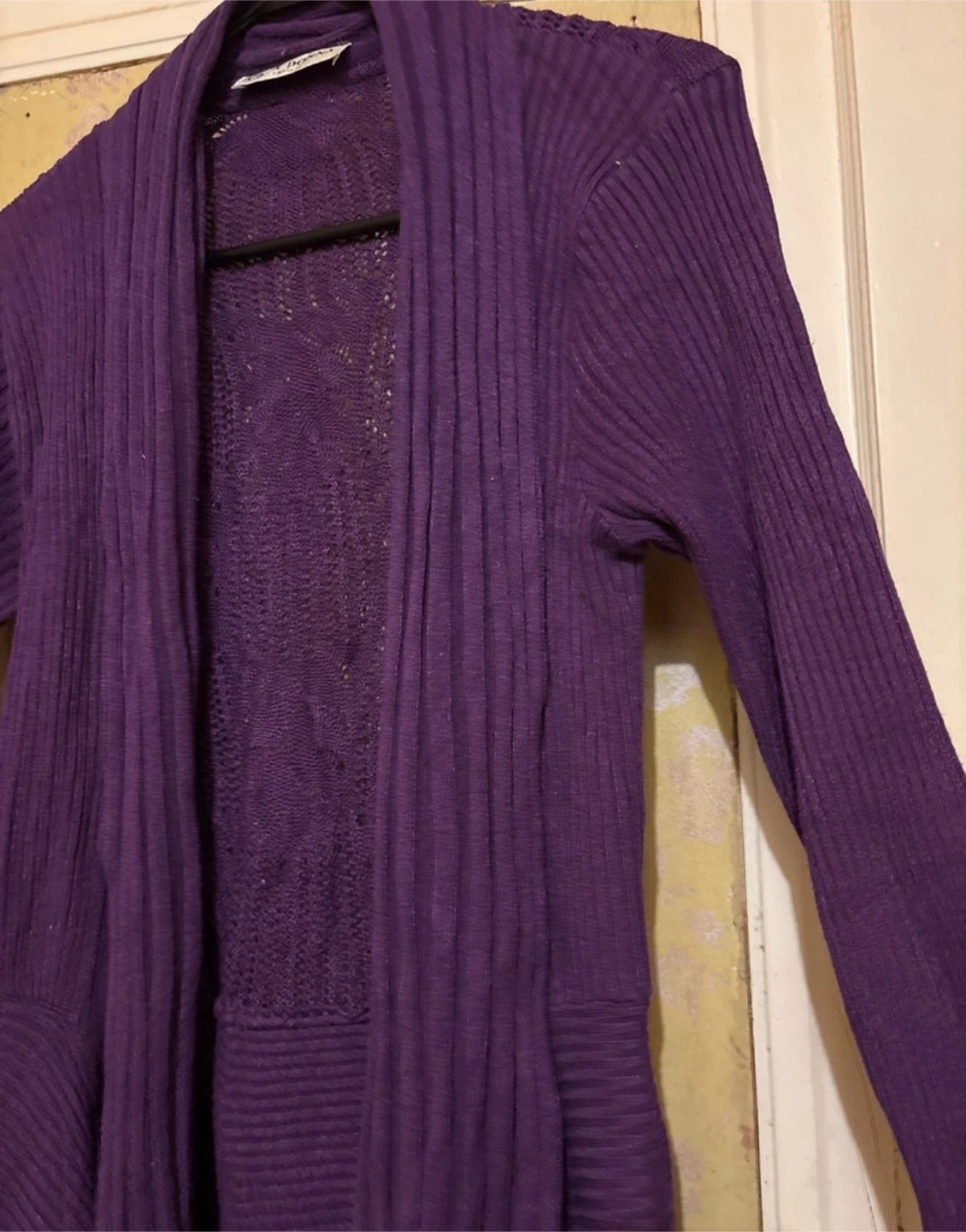 Add a touch of elegance to your wardrobe with this Casa Donna purple knit cardigan featuring an open-front design and delicate knit back. This cardigan is in good condition, showing only gentle signs of wear. It's perfect for layering and adding warmth to any outfit.