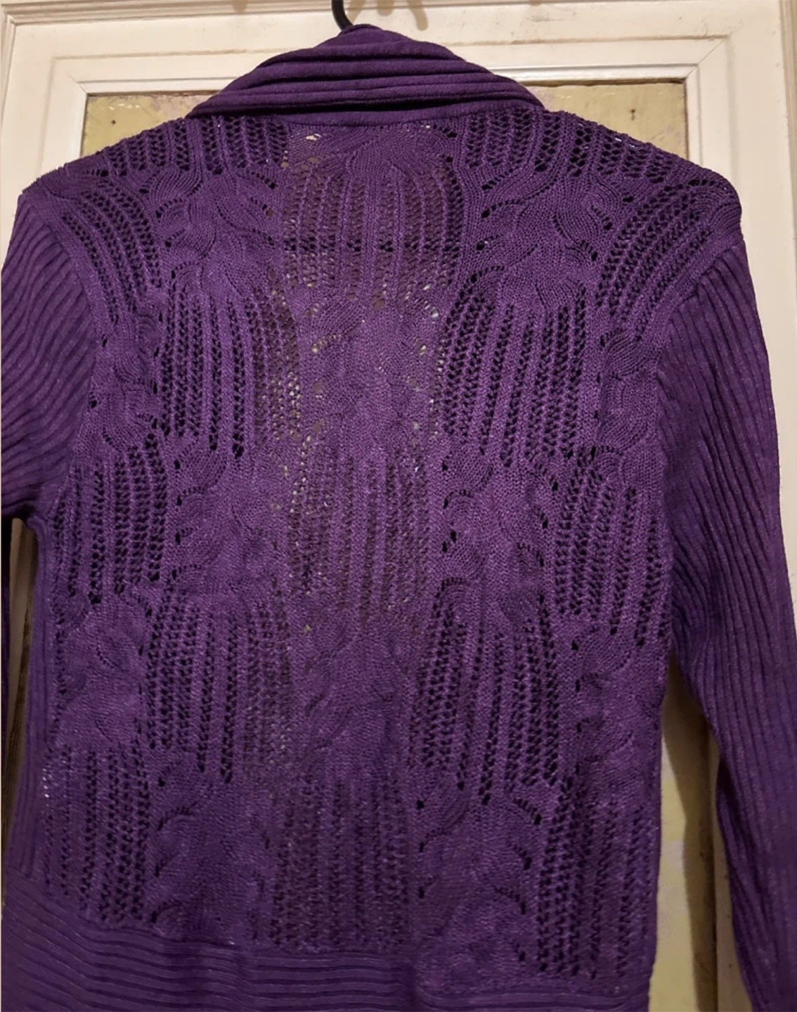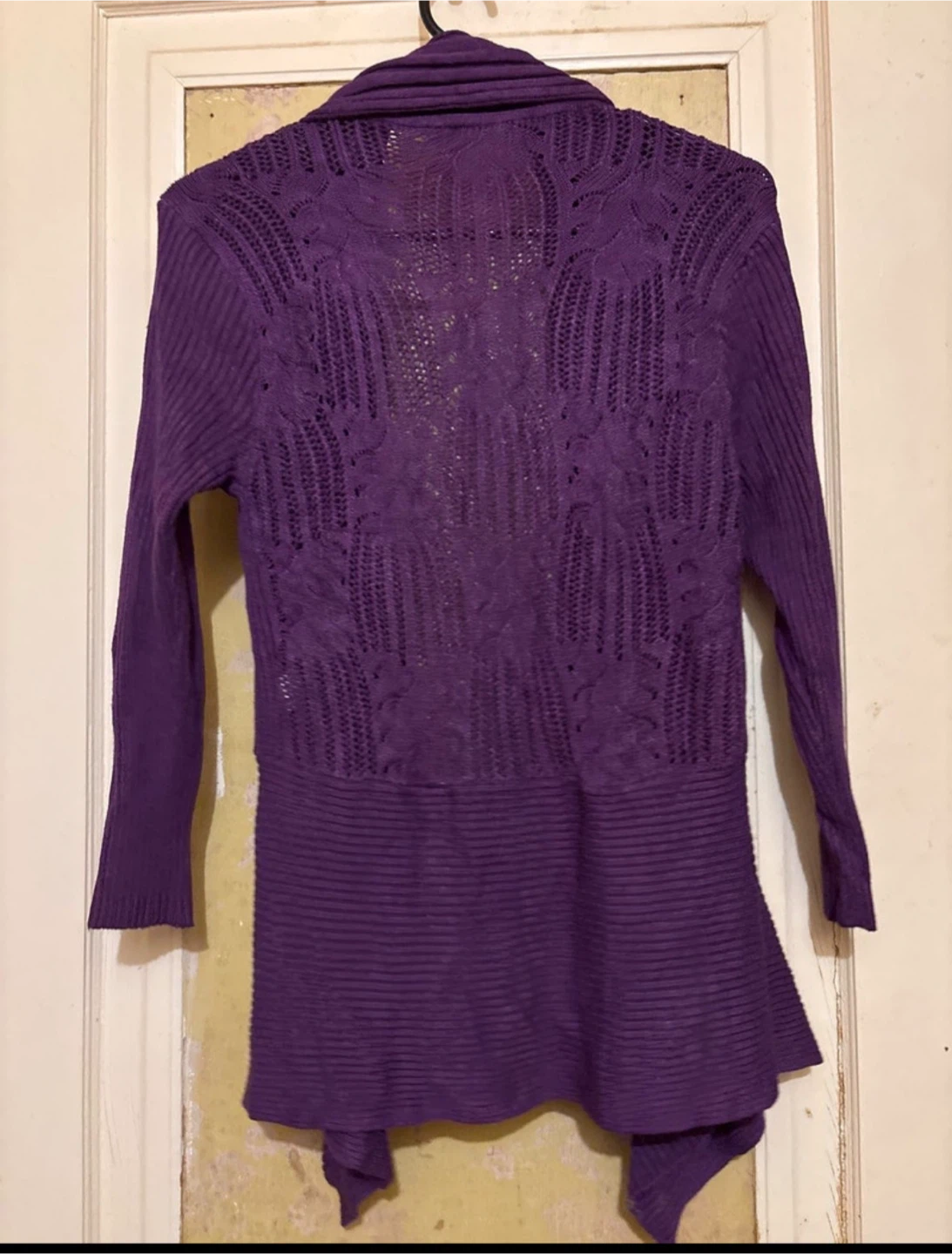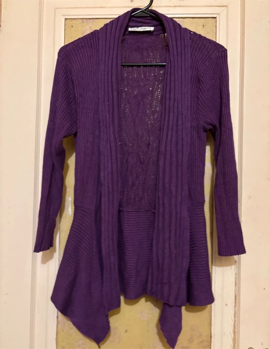 Add a touch of elegance to your wardrobe with this Casa Donna purple knit cardigan featuring an open-front design and delicate knit back. This cardigan is in good condition, showing only gentle signs of wear. It's perfect for layering and adding warmth to any outfit.