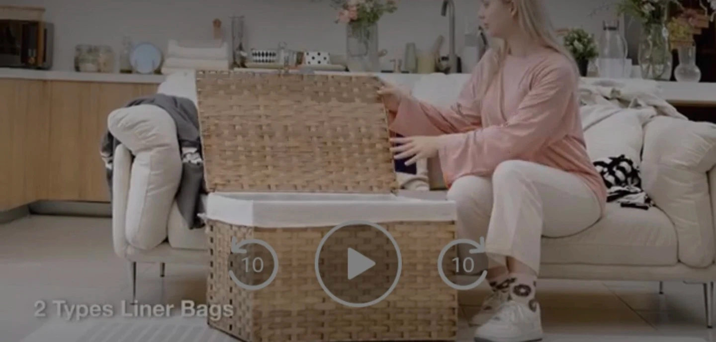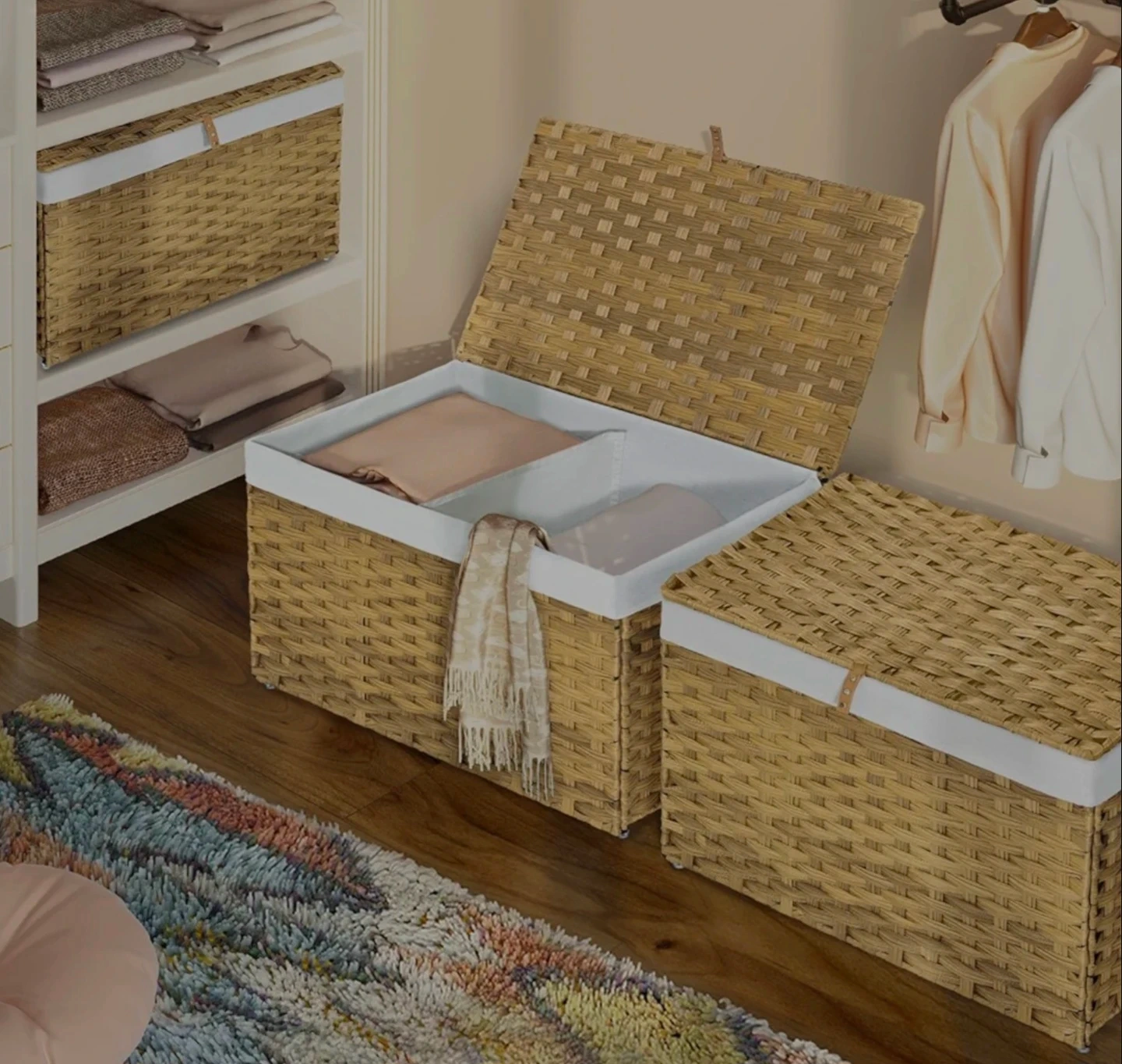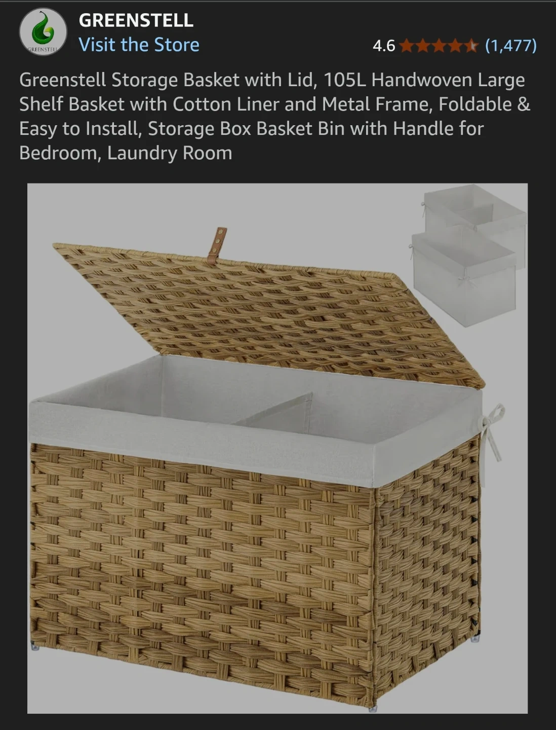 This is a Greenstell 105L handwoven storage basket with a lid. It features a cotton liner and a metal frame. The basket is natural in colour and measures 25.8x15.7x15.7 inches. It's foldable and includes a handle for easy carrying.