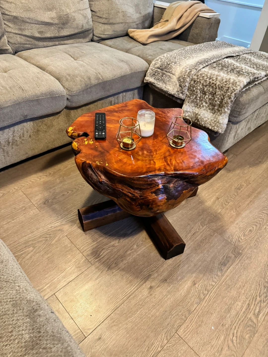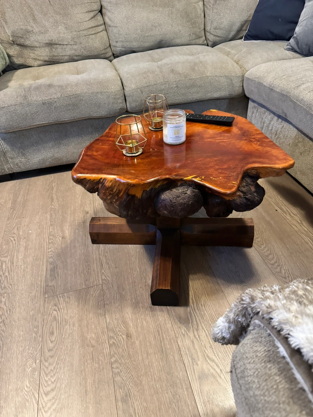 Unique live edge coffee table with a rich, polished wood finish. It's built with a sturdy wooden base. This table makes a statement piece for any living room!