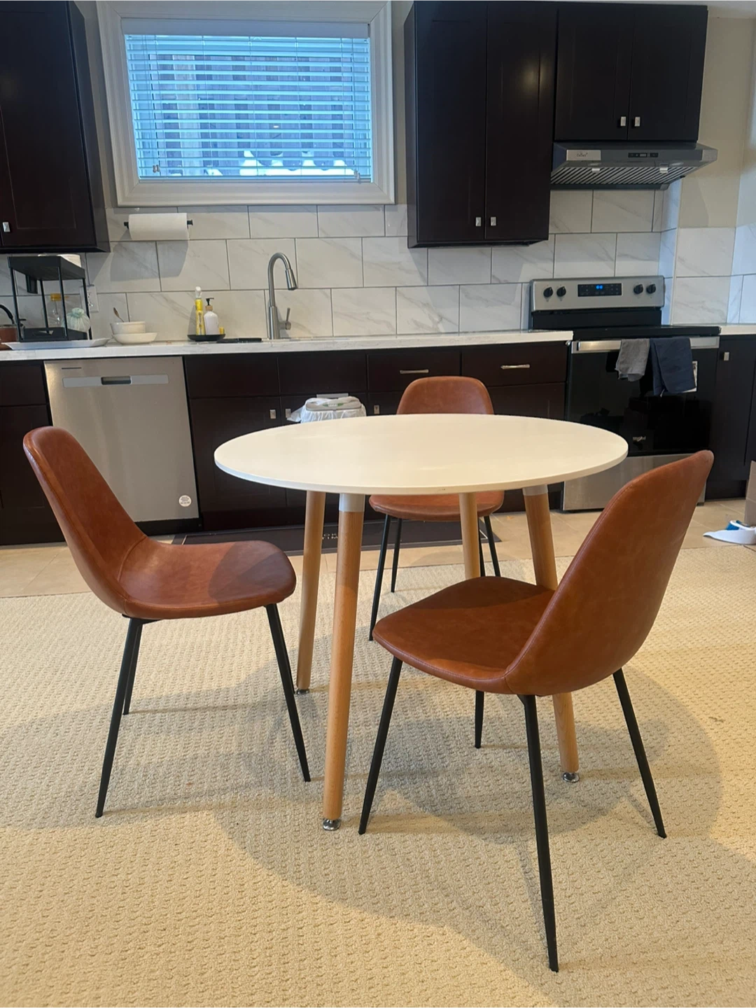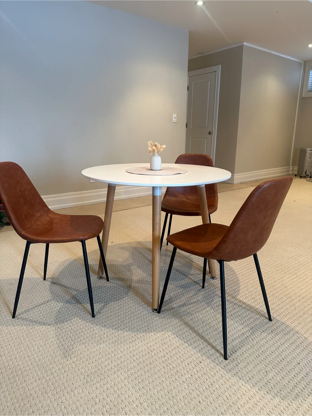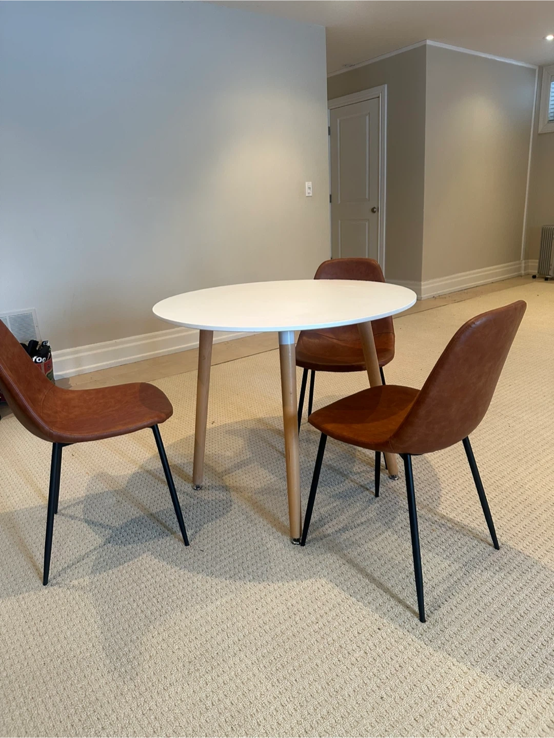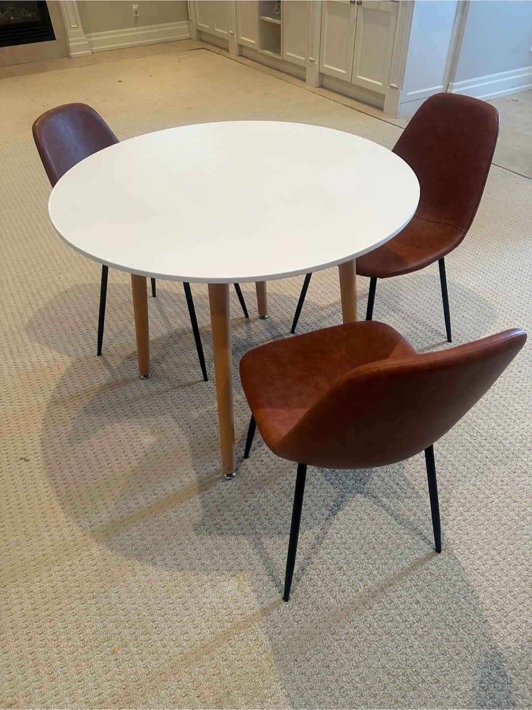 This set includes a white round dining table with wood legs and three brown faux leather chairs with black metal legs. It's a compact set suitable for smaller spaces. This dining set is great for a breakfast nook or a small dining area!