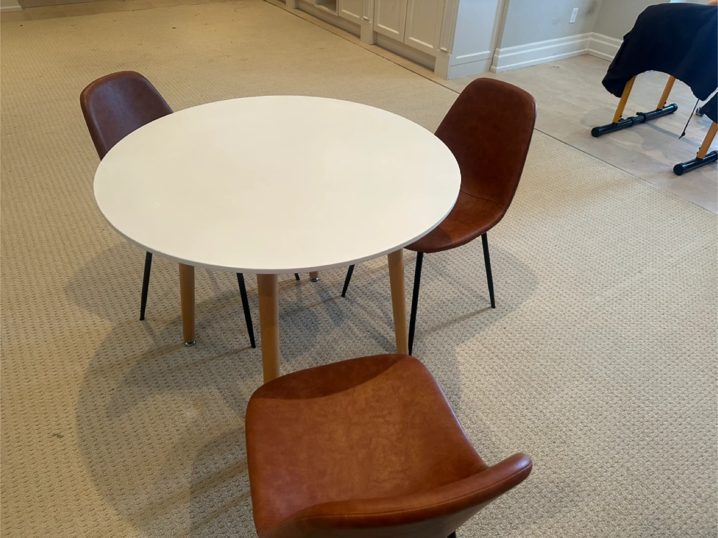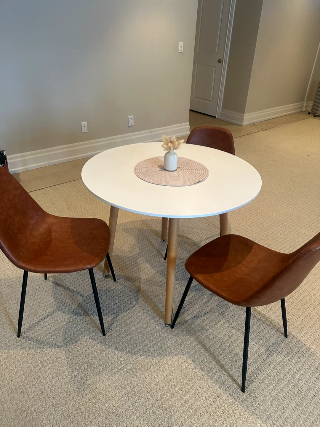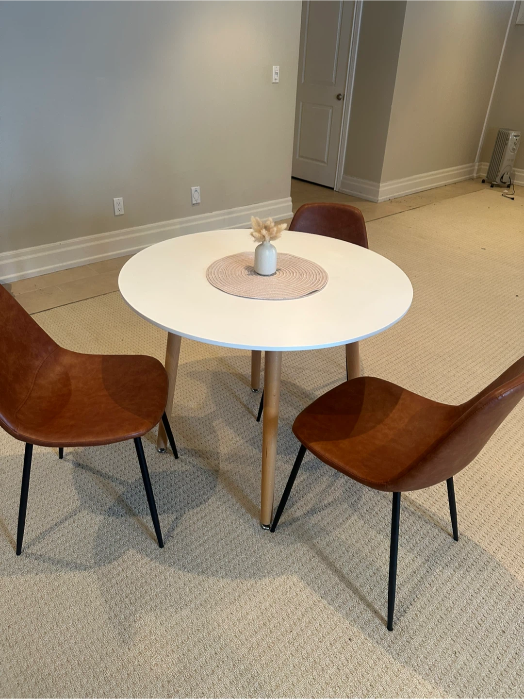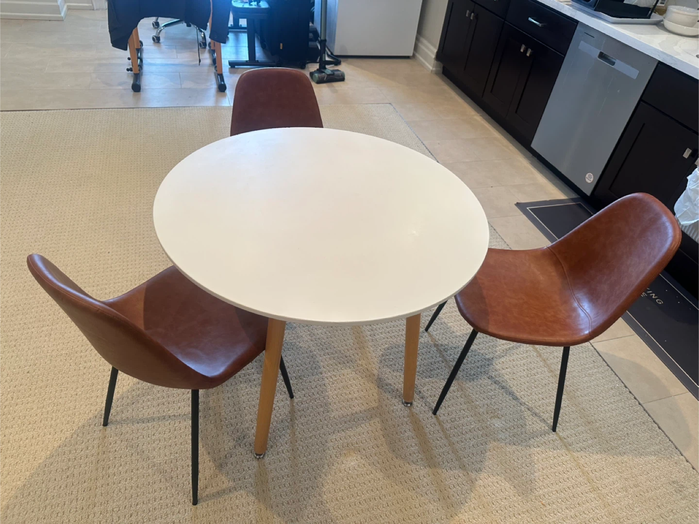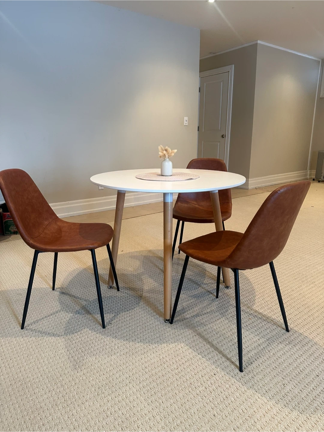 This set includes a white round dining table with wood legs and three brown faux leather chairs with black metal legs. It's a compact set suitable for smaller spaces. This dining set is great for a breakfast nook or a small dining area!