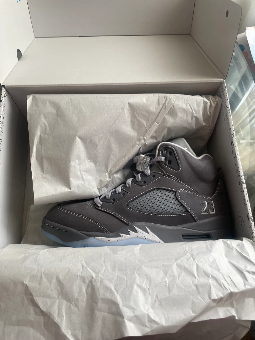 These Air Jordan 5 Retro sneakers come in a cool Wolf Grey colourway. They're size 10 US, 9 UK, 44 EU, and 280 cm. Includes original box and tissue paper.