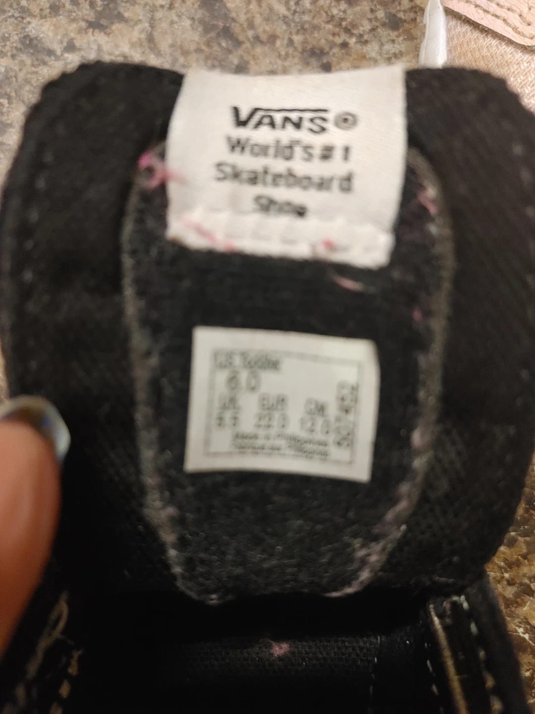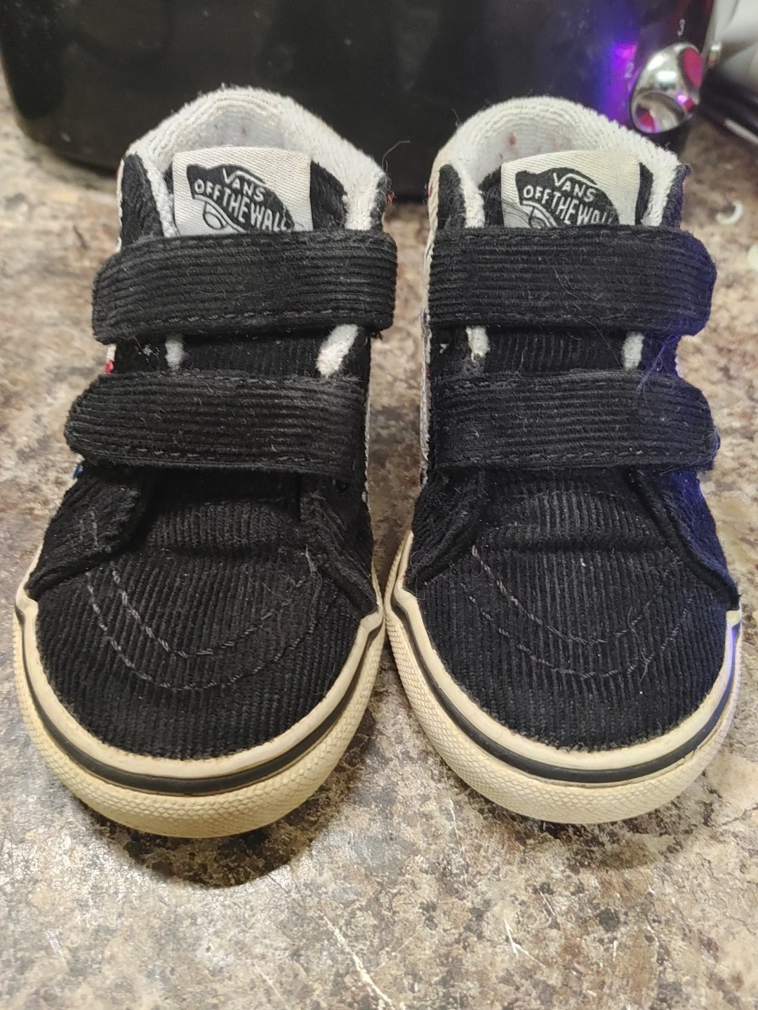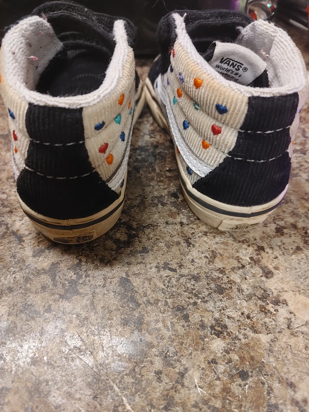 These are Vans Toddler Sk8-Hi Zip sneakers in a black corduroy with colourful hearts. They feature hook-and-loop straps for easy on and off. Size is 6 UK, 5.5 EUR, and 12.0 CM.