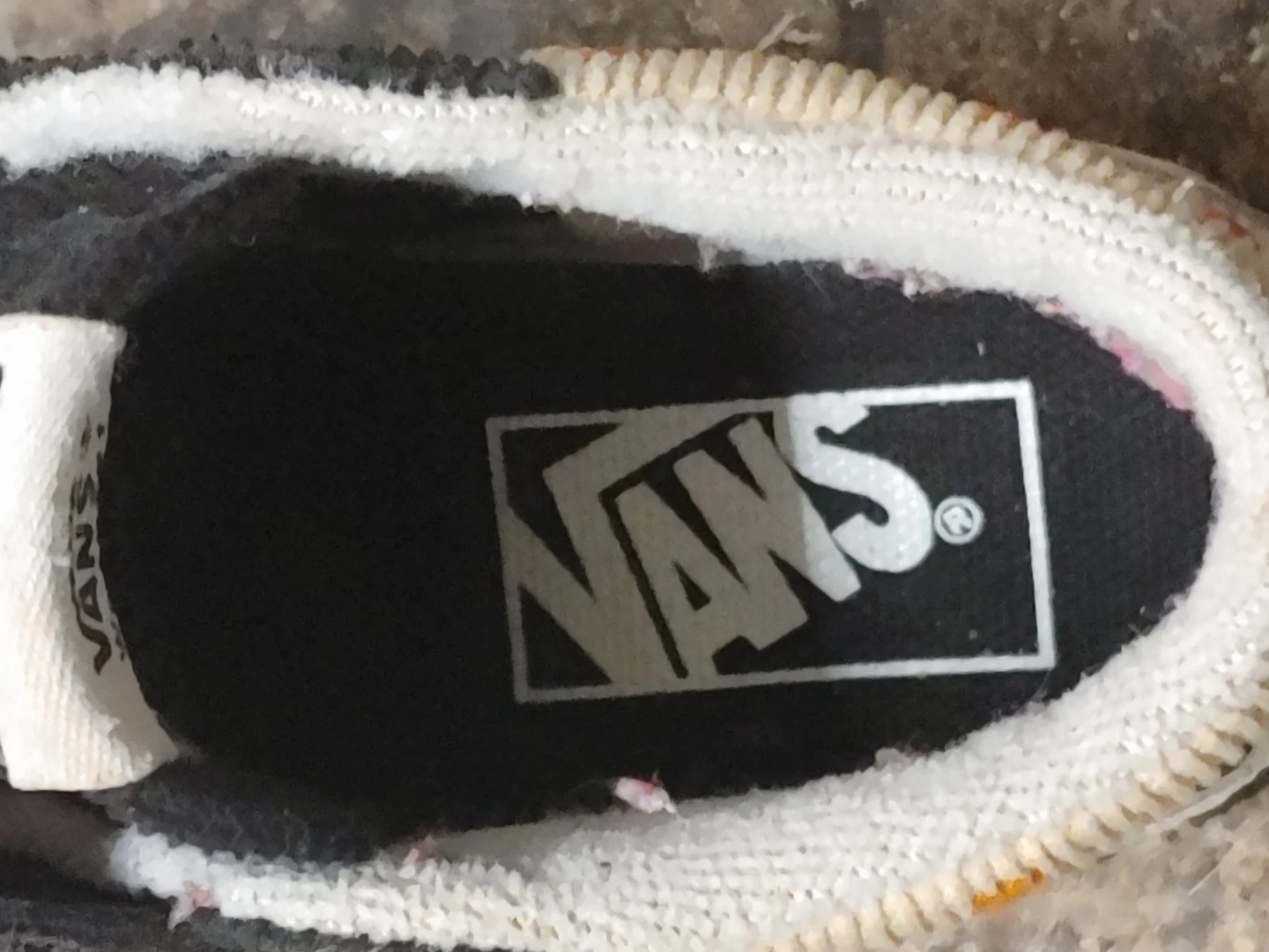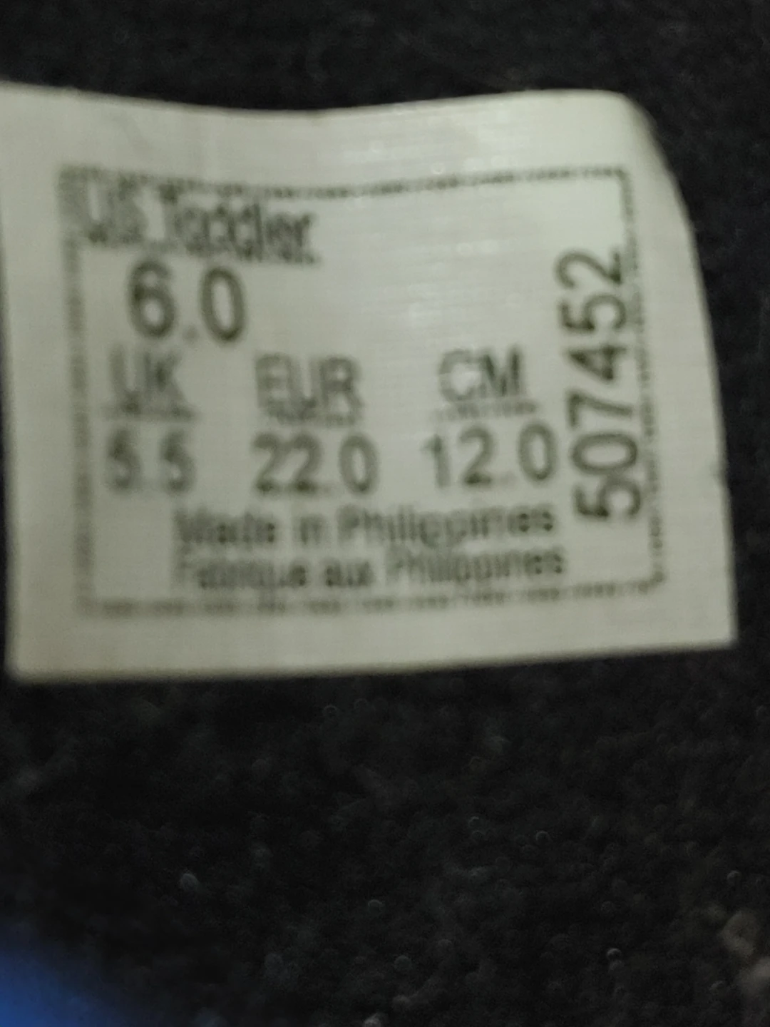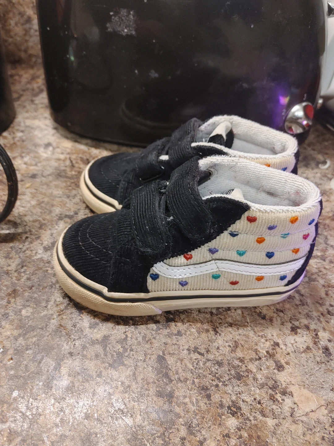 These are Vans Toddler Sk8-Hi Zip sneakers in a black corduroy with colourful hearts. They feature hook-and-loop straps for easy on and off. Size is 6 UK, 5.5 EUR, and 12.0 CM.
