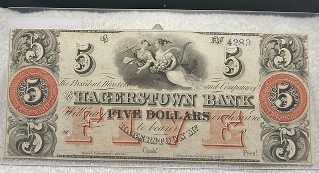 This is a used Hagerstown Bank five dollar note. This vintage bank note is a piece of history. It's a tangible link to a bygone era, perfect for collectors and history buffs alike. Despite its age, there is little wear and tear to the note, as can be seen in the image above; it’s very crisp and in great shape. Cash accepted. Cashless payment accepted.
