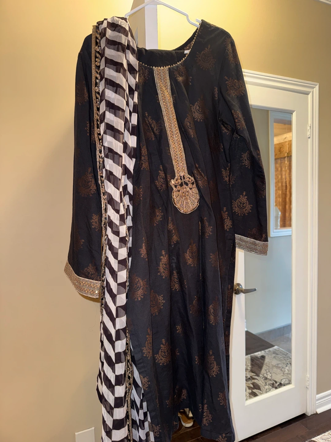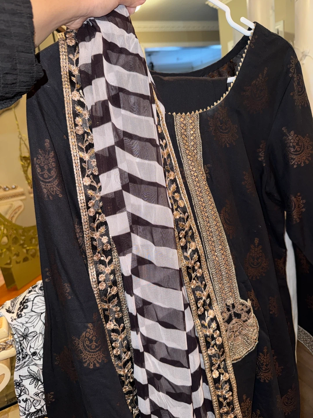 This is a black embroidered kurta set featuring a printed design. It comes with a matching duppata. The fabric appears to be lightweight, suitable for various occasions.
