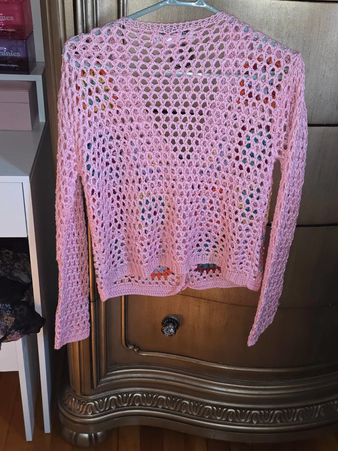 This pink crochet cardigan features a colorful granny square design. It's a V-neck style with long sleeves and a button front. Made from cotton. Pit to pit: 19" Length: 22"