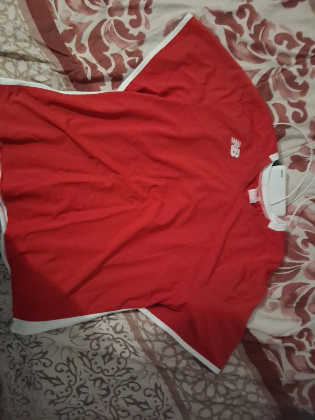 New Balance red t-shirt with white trim. Short sleeves. Made with comfortable fabric for everyday wear. Perfect for sports or casual outings!
