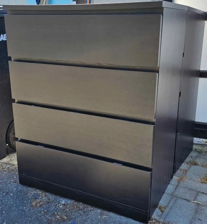 Selling a used IKEA Hemnes dresser in black-brown. It has four drawers and is in good condition. Perfect for adding storage to any room!