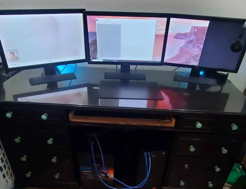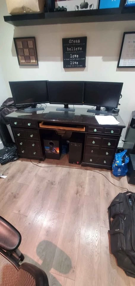 Selling one office / computer desk. Solid wood. This is a beautiful piece! Comes with a glass top. Dimensions are: 2'5" height, 5'5" length, 2'5" depth. All drawers working perfectly. Still have the front matching board for the keyboard tray drawer to hide the opening. Comes with all hardware, extra handles, etc. Comes apart if need be in 3 sections. Glass is also removable.