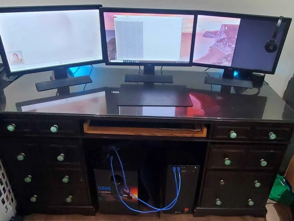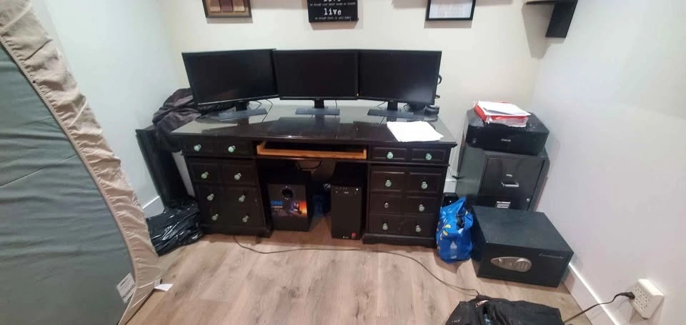 Selling one office / computer desk. Solid wood. This is a beautiful piece! Comes with a glass top. Dimensions are: 2'5" height, 5'5" length, 2'5" depth. All drawers working perfectly. Still have the front matching board for the keyboard tray drawer to hide the opening. Comes with all hardware, extra handles, etc. Comes apart if need be in 3 sections. Glass is also removable.