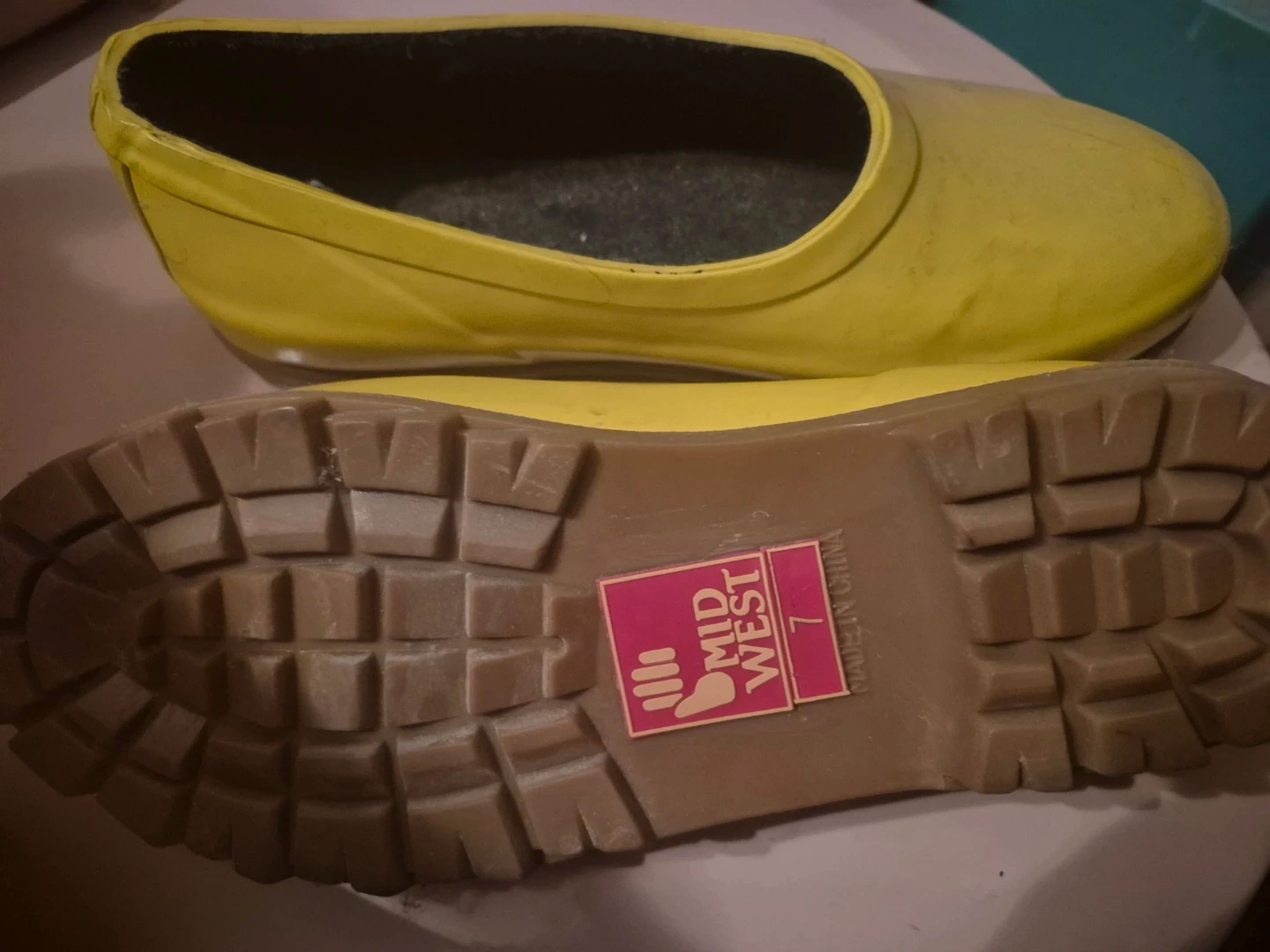 These are yellow rubber clog shoes from Mid West. They are a size 7. These shoes are waterproof and have a durable sole.