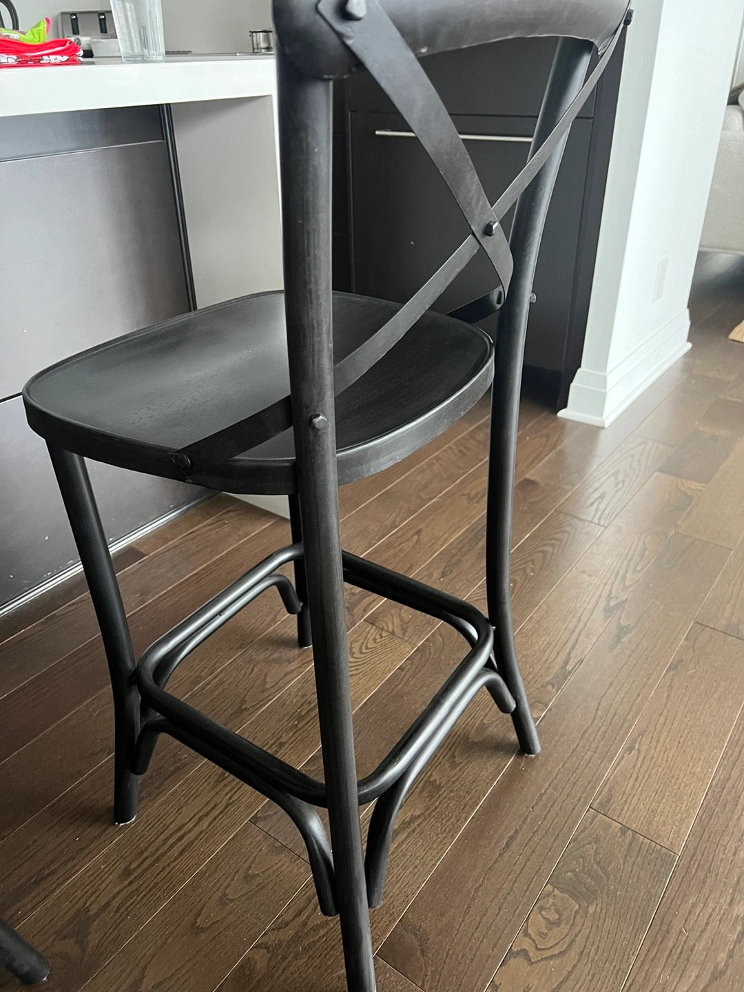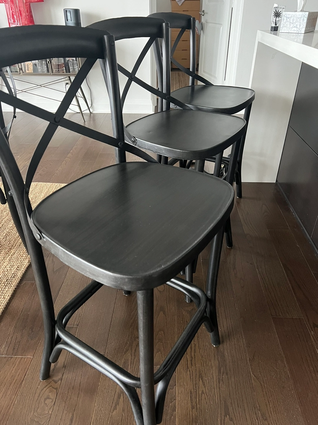 Set of 3 black bar stools with cross back design. Metal frame. Excellent condition. Hardly used.