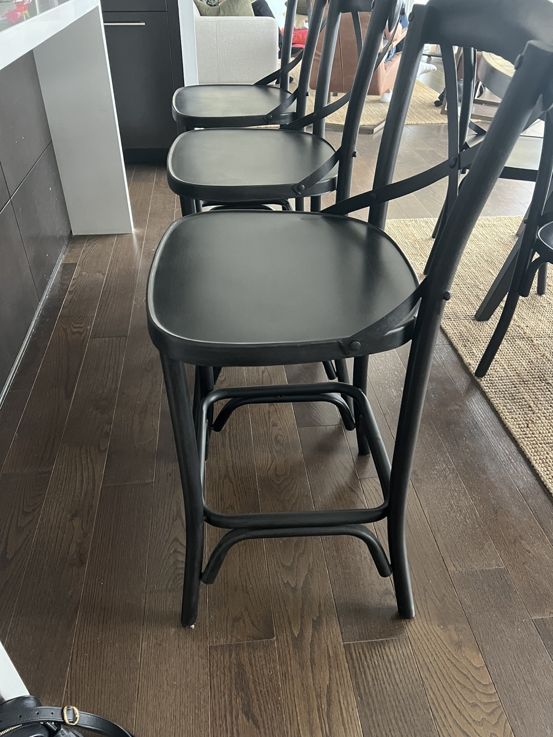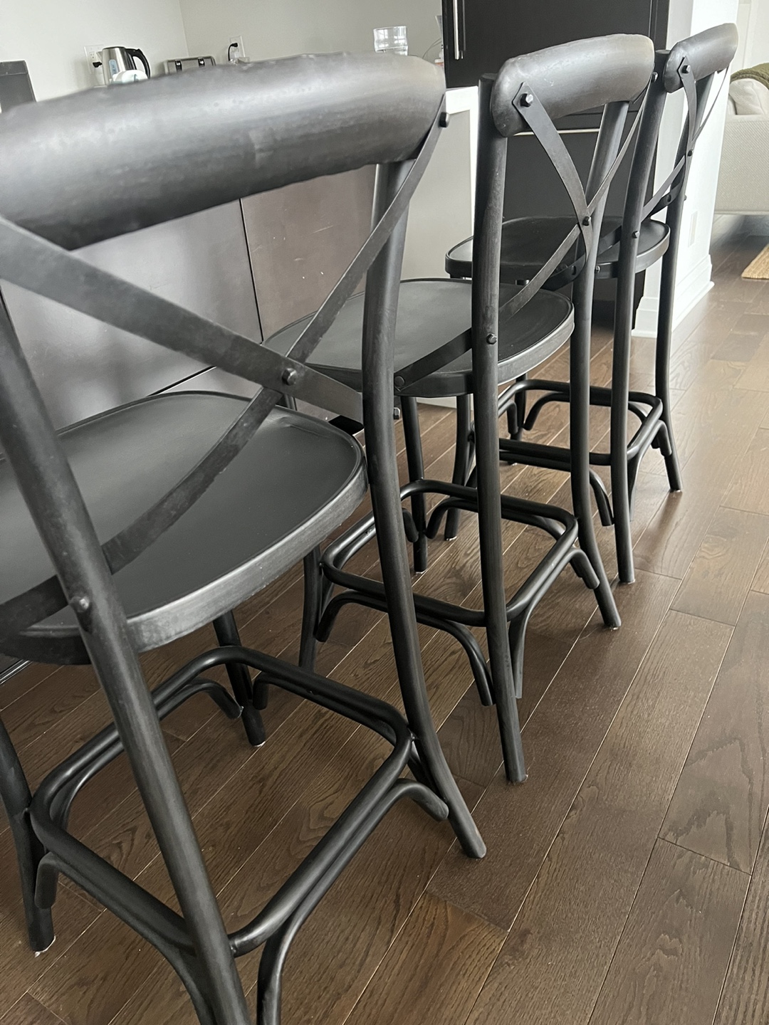 Set of 3 black bar stools with cross back design. Metal frame. Excellent condition. Hardly used.