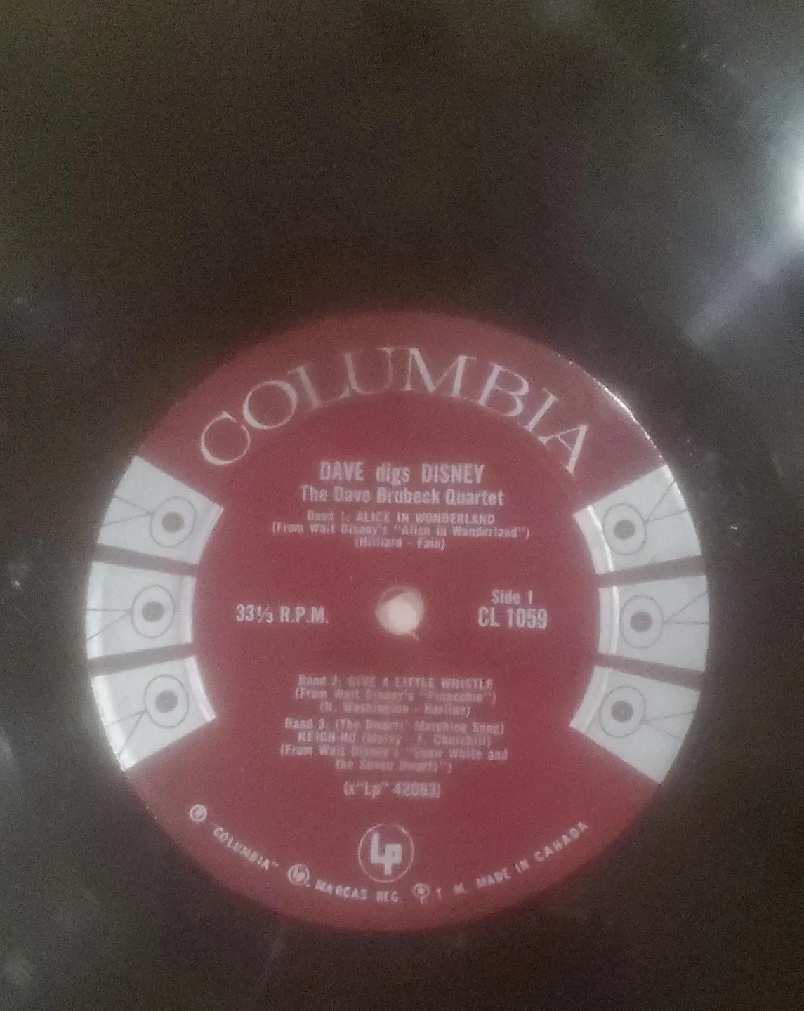 Selling a vinyl record of Dave Digs Disney by The Dave Brubeck Quartet. This record includes the songs Alice in Wonderland and Give a Little Whistle. It's a Columbia record, playing at 33 1/3 R.P.M, Side 1 CL 1059. A great addition to any vinyl collection!