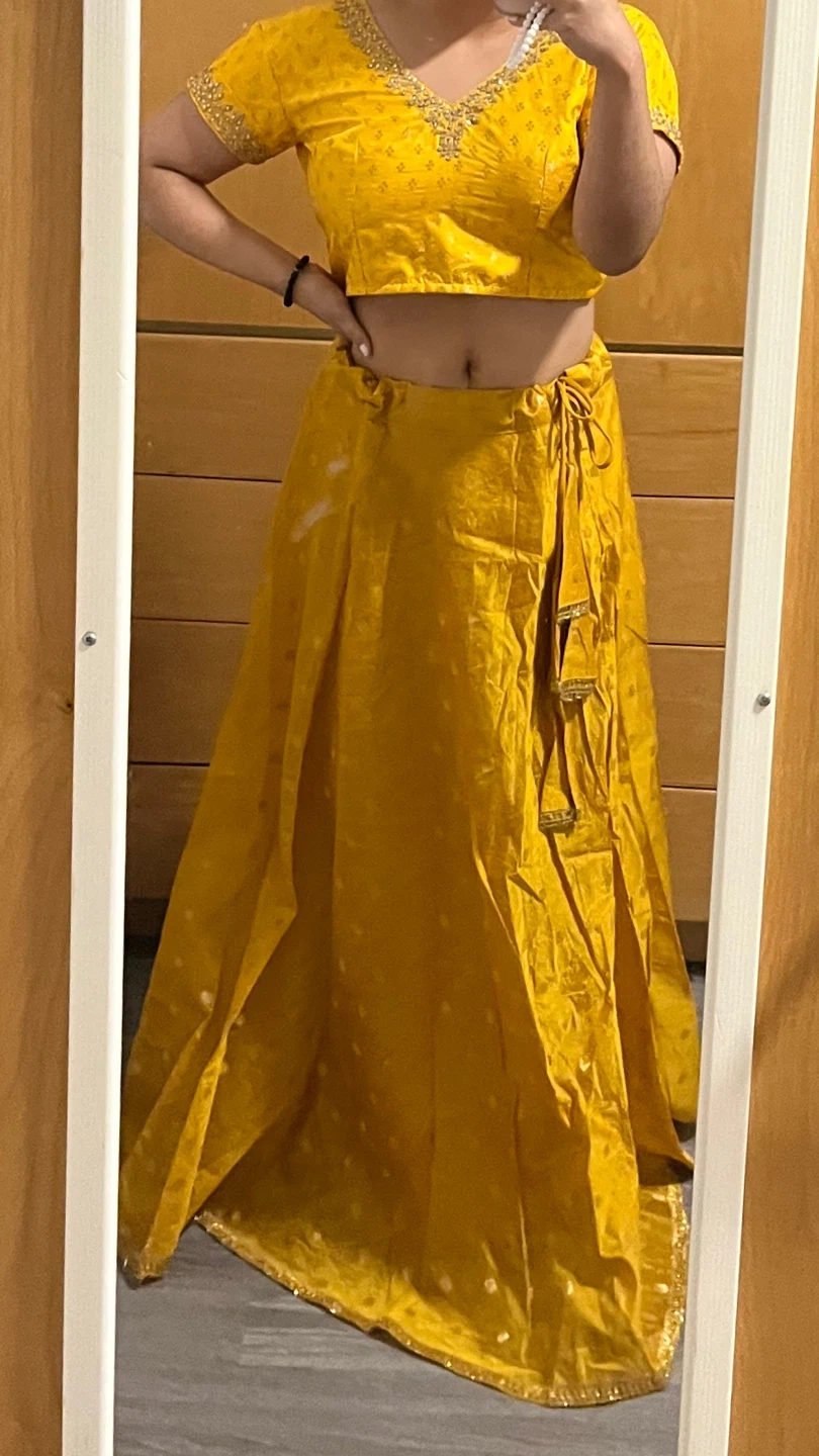 Selling a beautiful yellow lehenga set, perfect for a special occasion! The skirt is flowy and the top is a crop style with delicate detailing. It's in great condition and ready for a new home!
