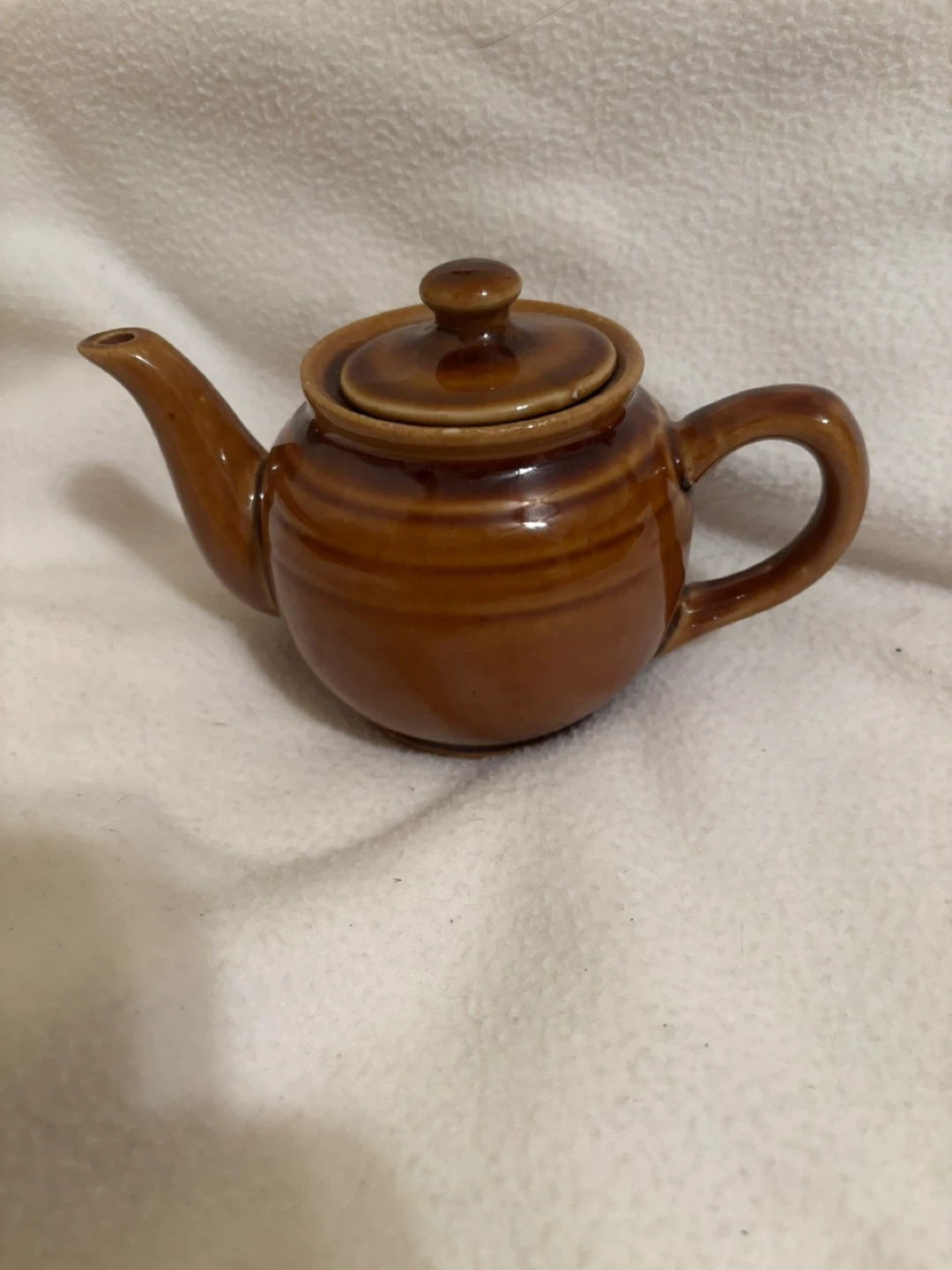 This is a small, brown ceramic teapot. It's glazed and has a classic rounded shape with a handle and spout. It's suitable for serving a single cup of tea.