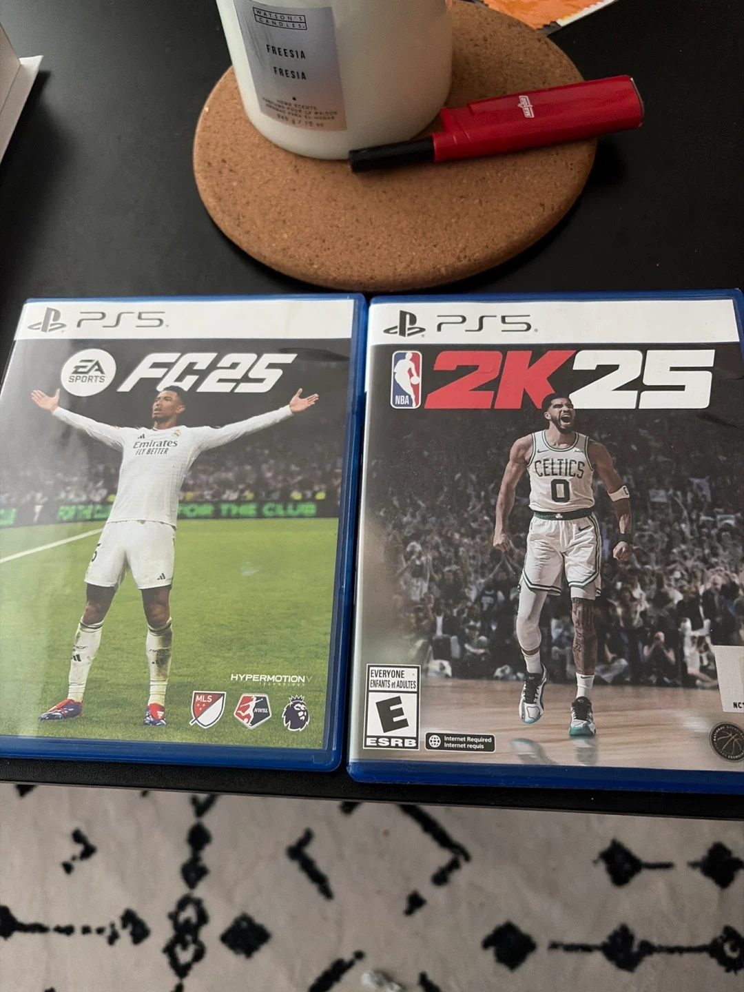 Selling two PlayStation 5 games: EA Sports FC 25 and NBA 2K25. Both games are for the PS5 console. FC 25 includes MLS, NWSL, and Premier League licenses. NBA 2K25 is rated E for Everyone. These games offer realistic sports simulations for fans.