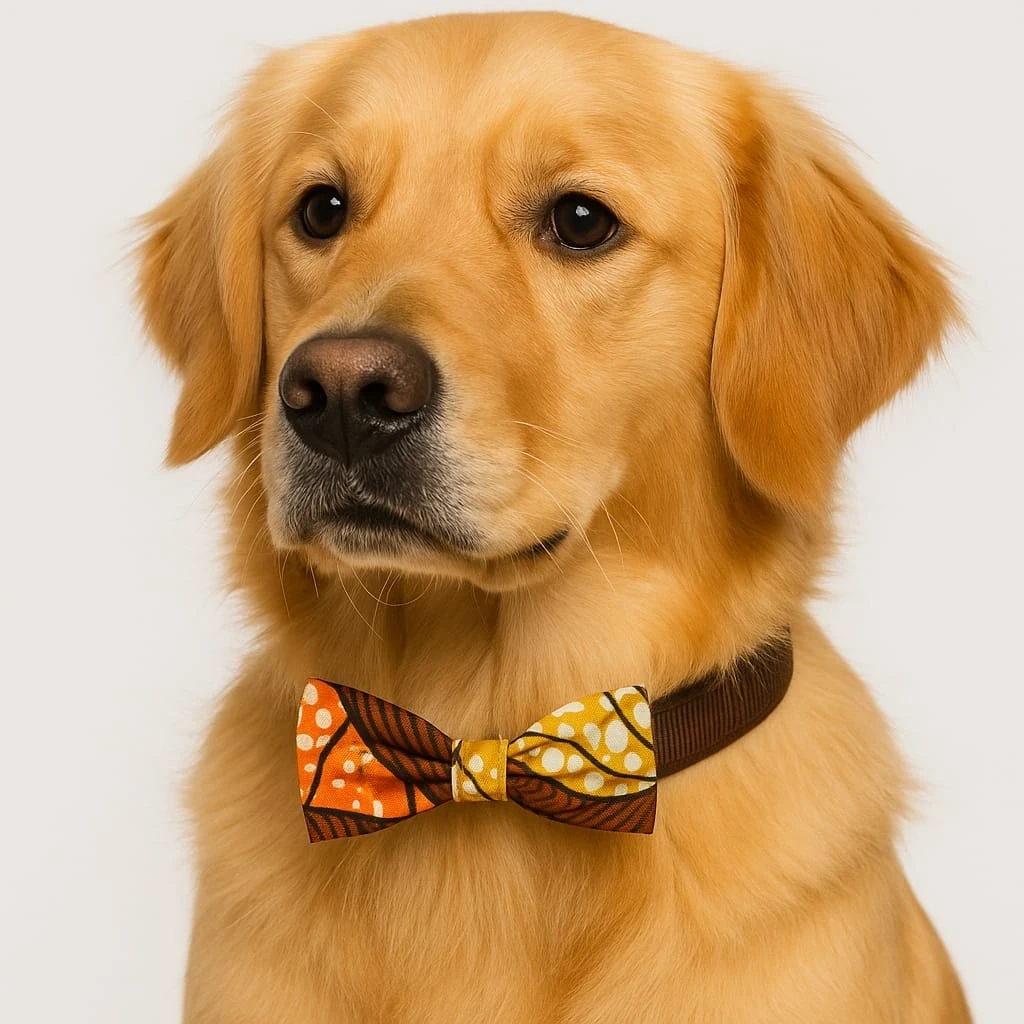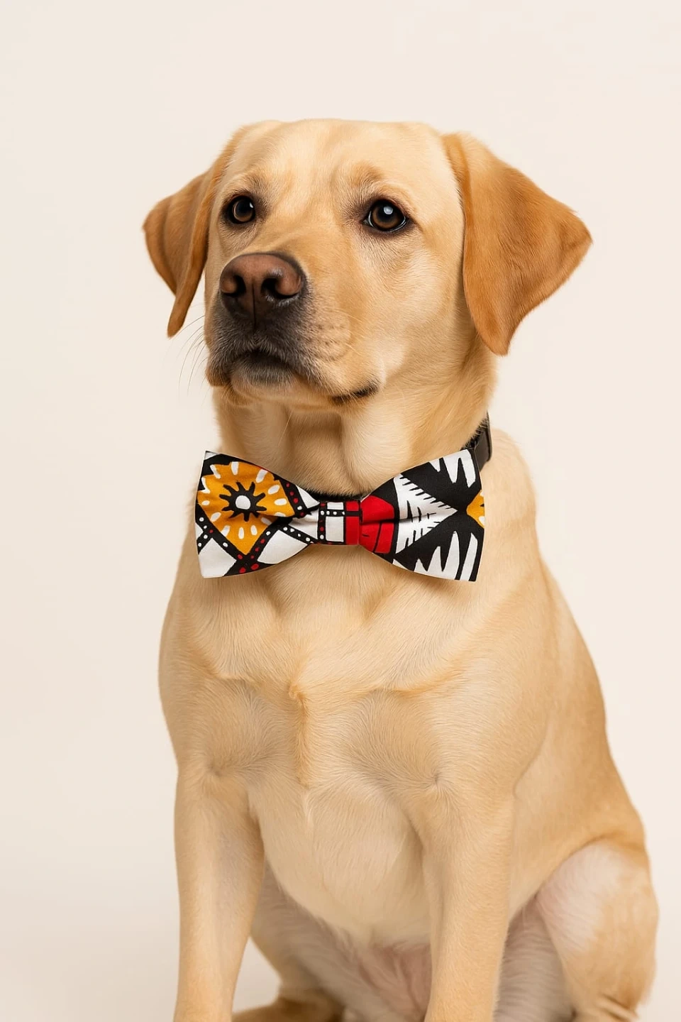 A collection of decorative bow ties designed to be attached to a dog's collar. They come in various patterns and colours to add a touch of style. Each bow tie is made of fabric and includes a small loop on the back for collar attachment.