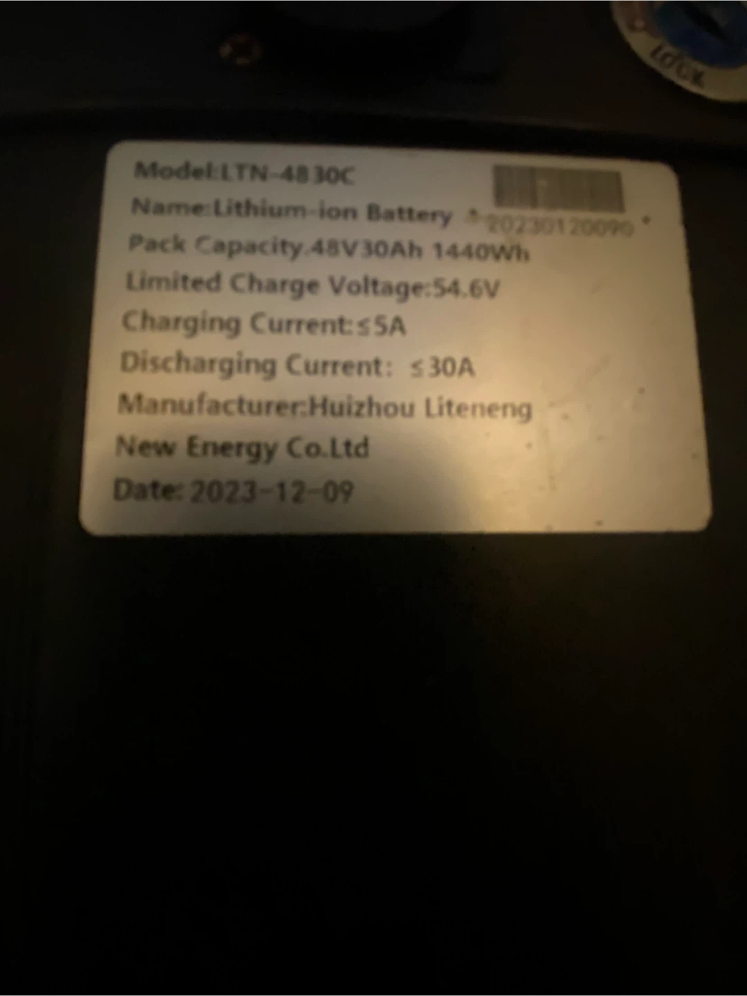 LTN-48 30C Lithium-ion Battery. Pack capacity is 48V 30Ah 1440Wh. Limited charge voltage 54.6V. Charging current is less than 5A. Discharging current is less than 30A. Manufactured on December 9, 2023.