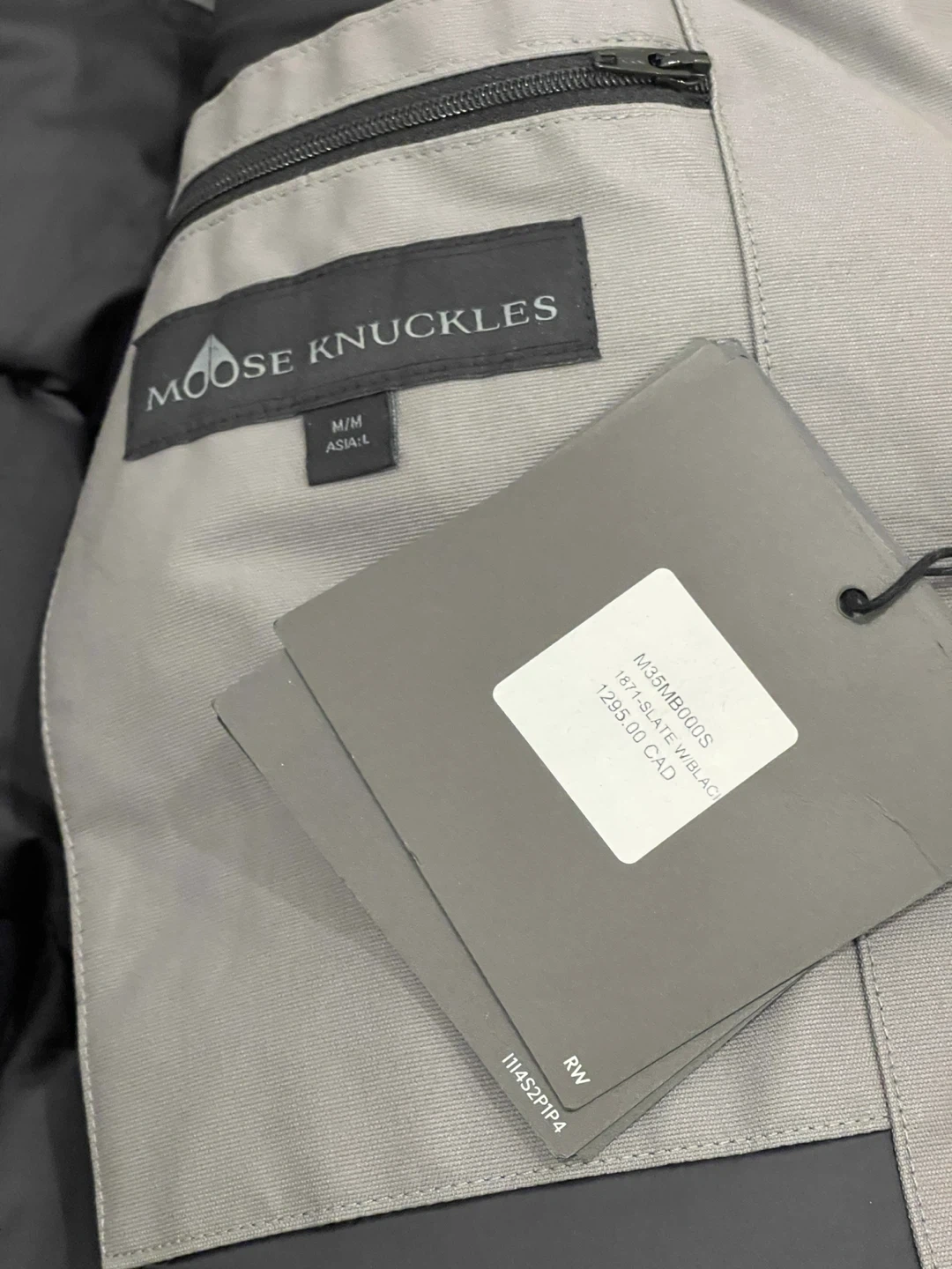 Grey Moose Knuckles bomber jacket with black rib-knit cuffs and hem. It has a hooded design and silver-tone hardware. This jacket is great for staying warm on colder days.
