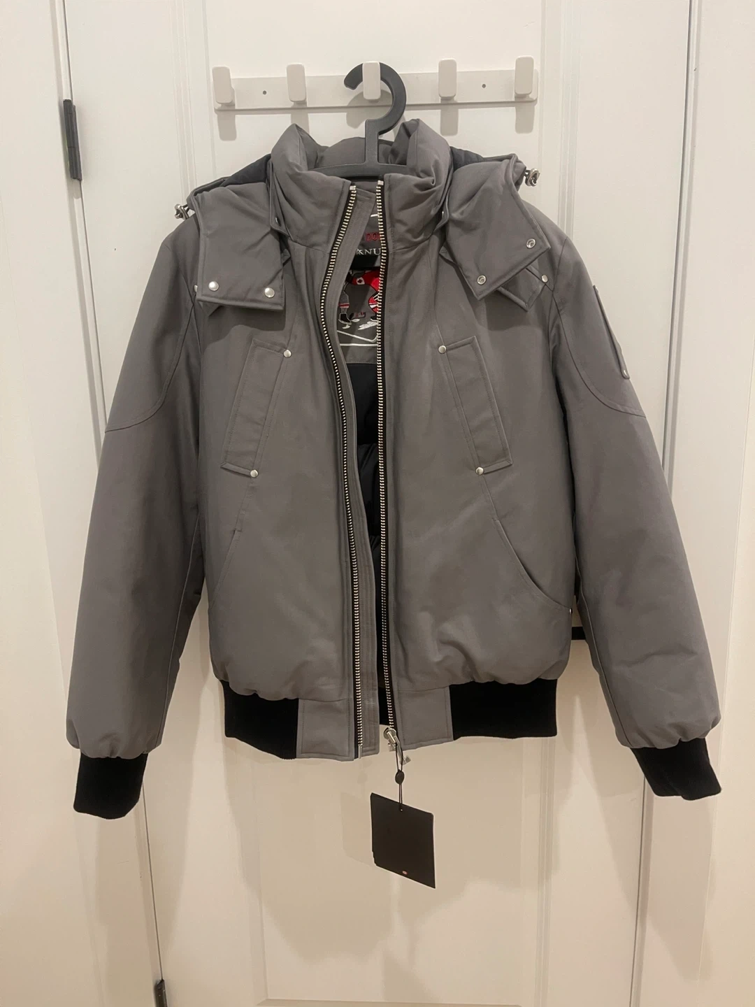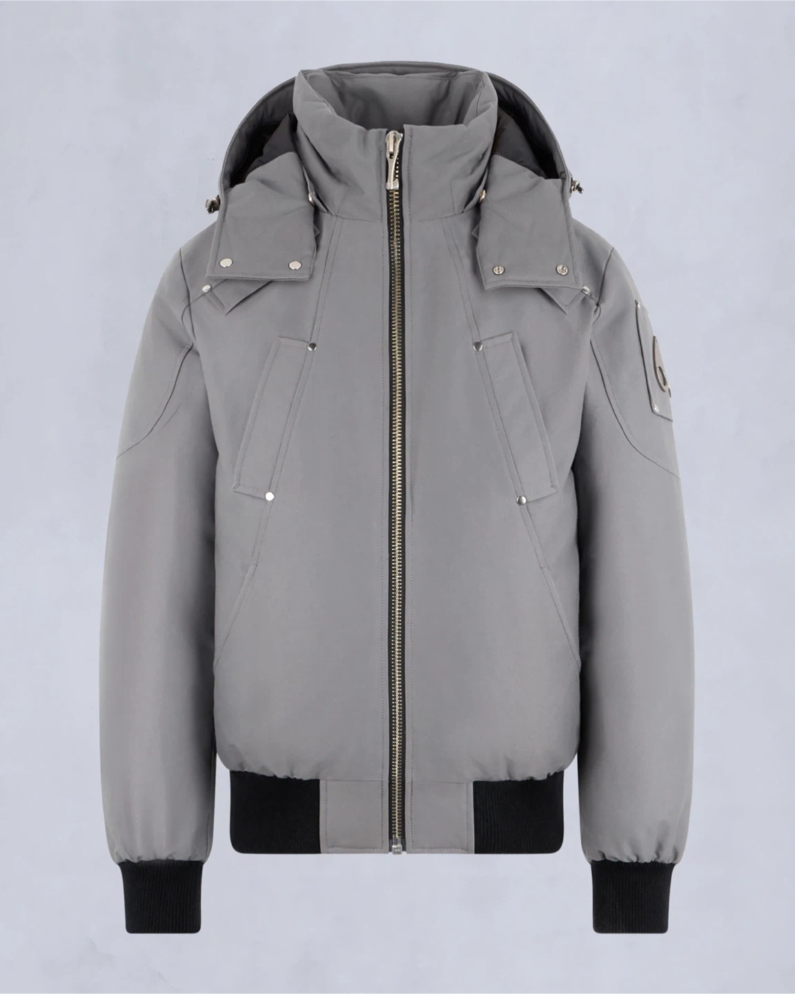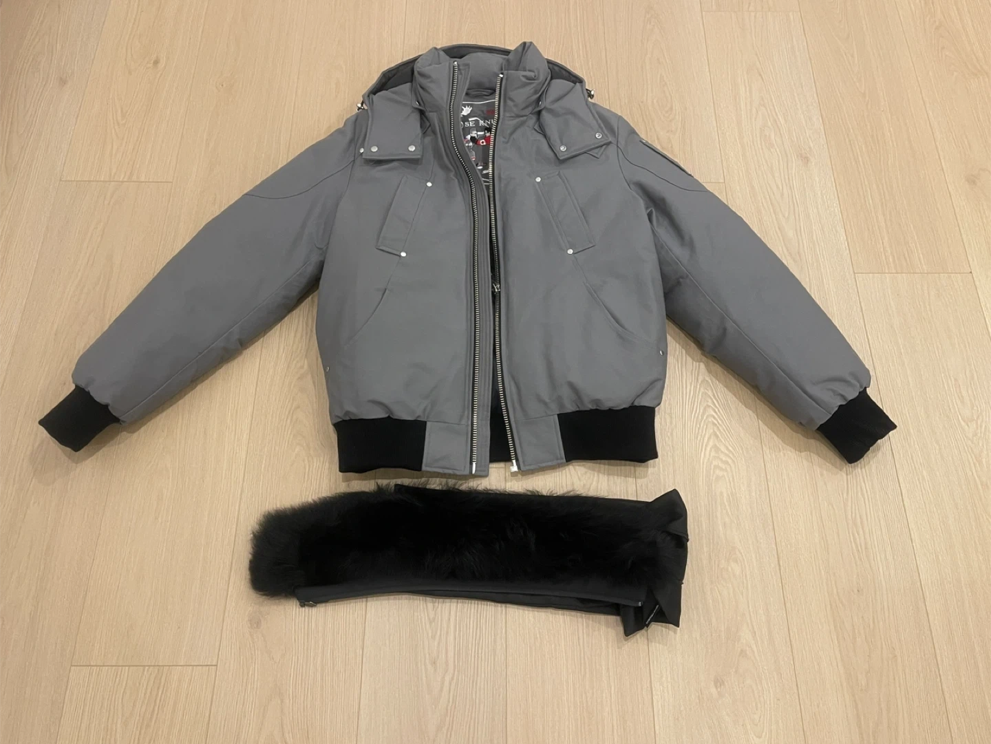 Grey Moose Knuckles bomber jacket with black rib-knit cuffs and hem. It has a hooded design and silver-tone hardware. This jacket is great for staying warm on colder days.