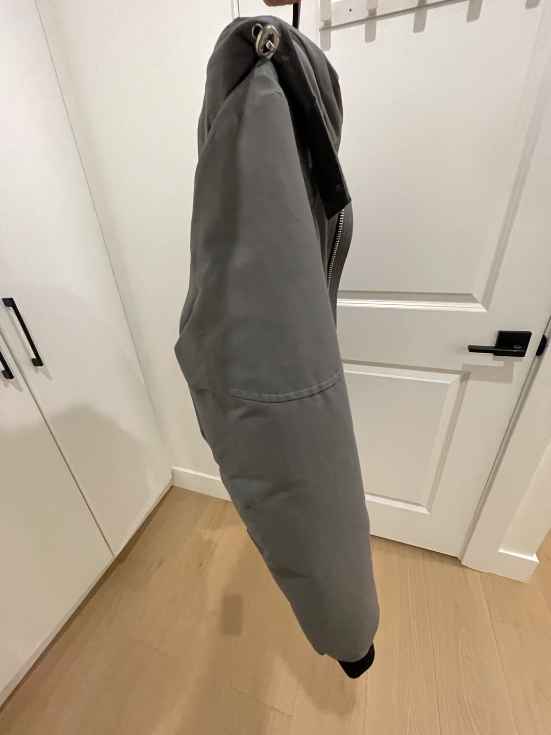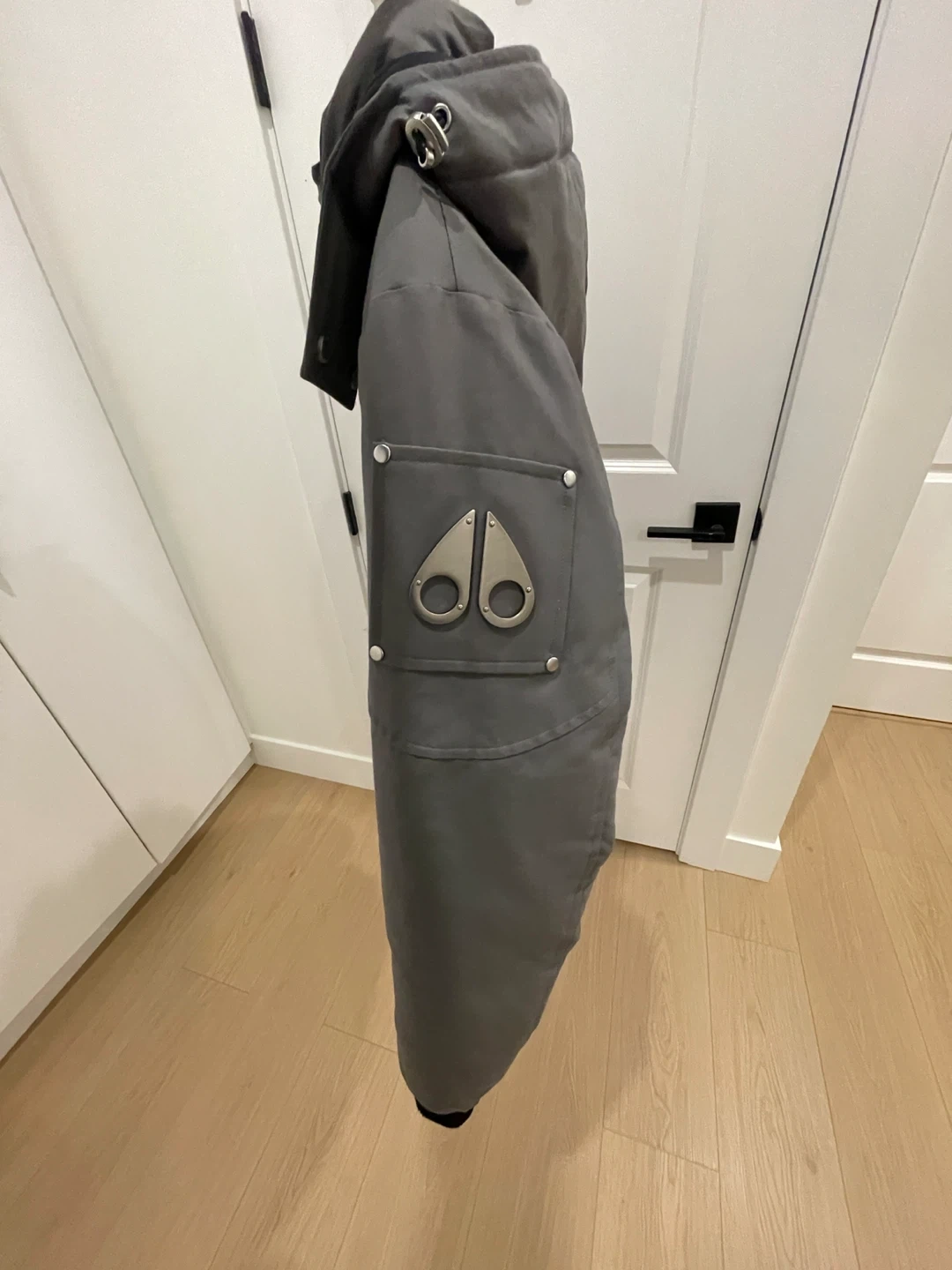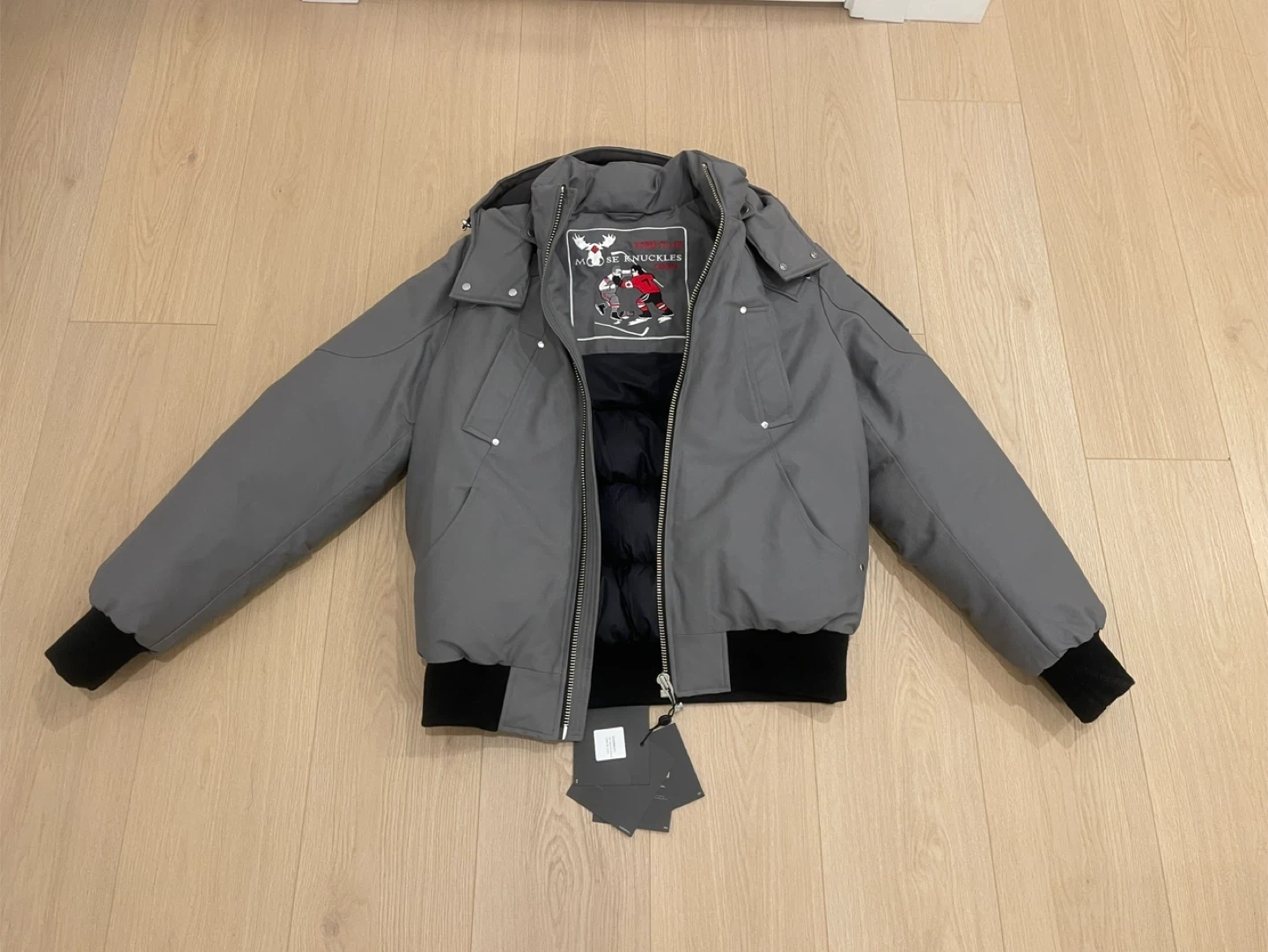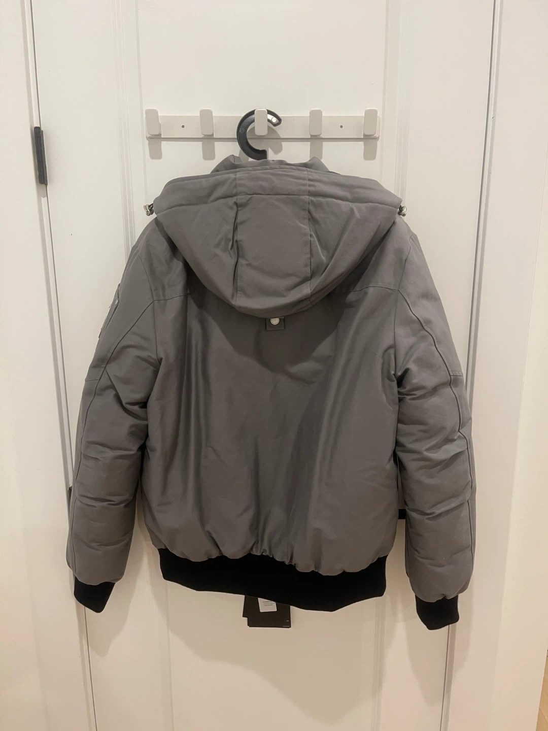 Grey Moose Knuckles bomber jacket with black rib-knit cuffs and hem. It has a hooded design and silver-tone hardware. This jacket is great for staying warm on colder days.