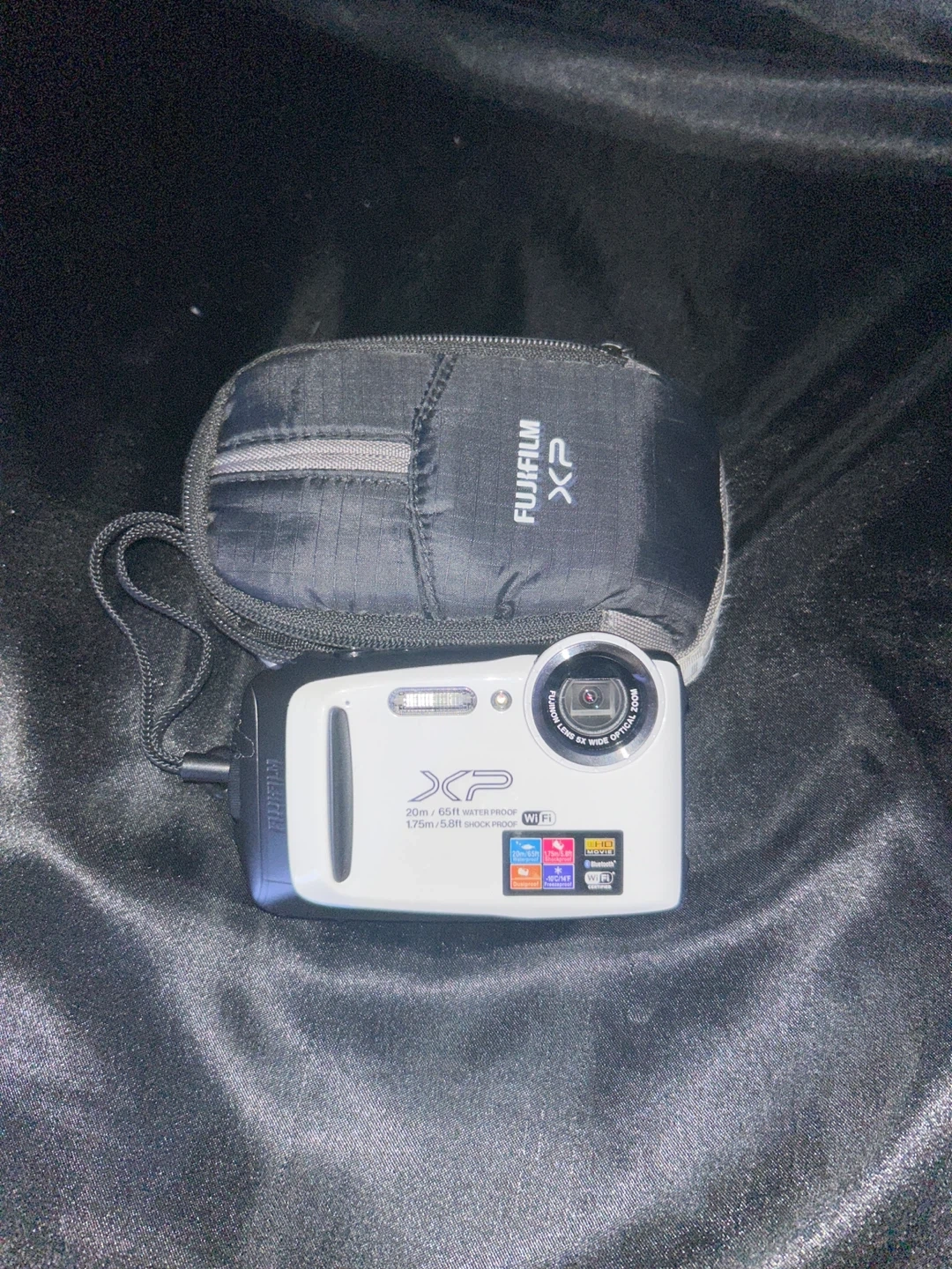 This is a Fujifilm XP digital camera with Wi-Fi connectivity. It's waterproof up to 20m (65ft) and shockproof from 1.75m (5.8ft). It also features wide optical zoom. It comes with a carrying case.