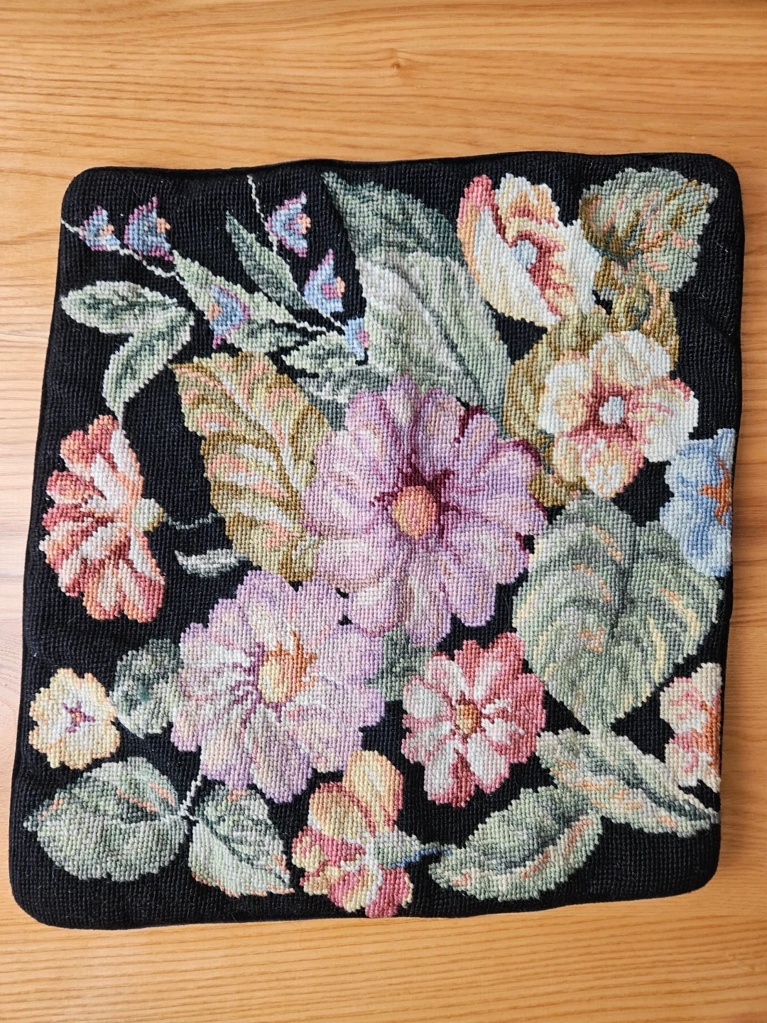 A tapestry cushion cover with a floral design on a black background. The stitching creates a textured, detailed floral pattern. Perfect for adding a touch of vintage charm to your home décor!