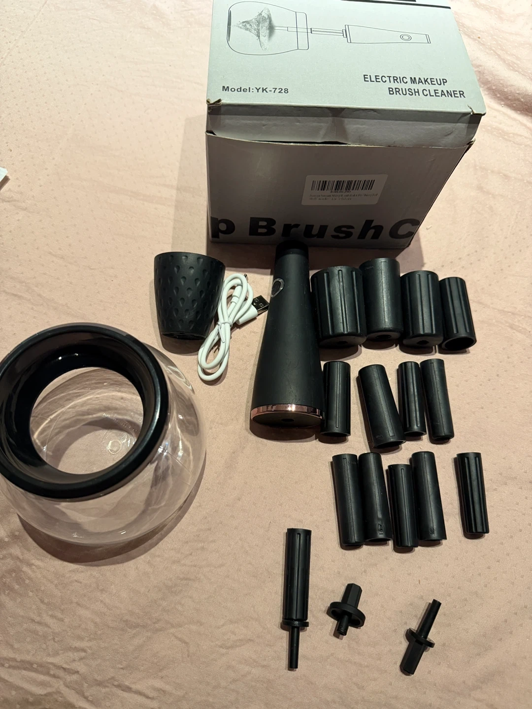 This electric makeup brush cleaner kit automatically cleans and dries your brushes. It comes with multiple rubber holders and a USB charging cable. Simply attach your brush, dip it in the water, and press the button to start cleaning!