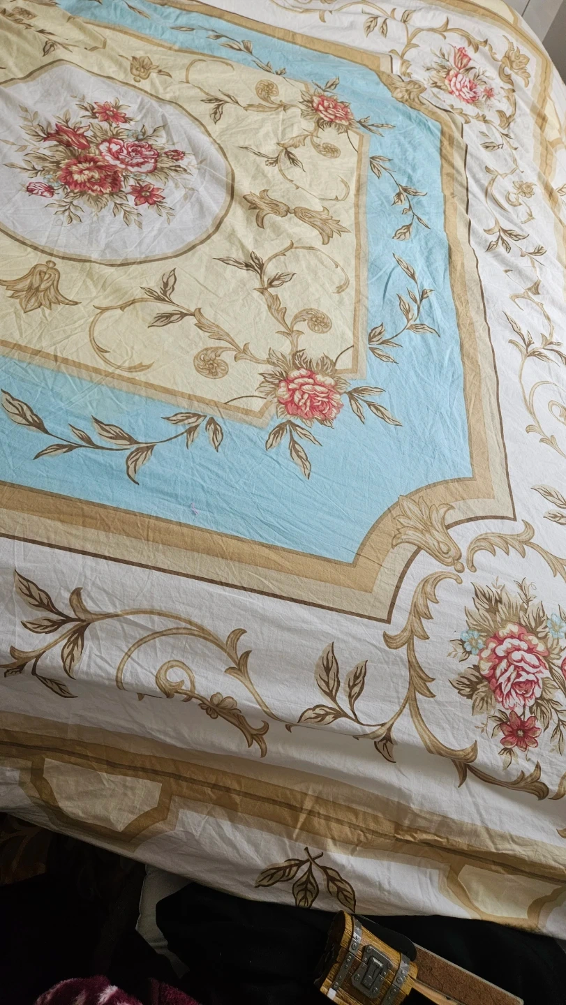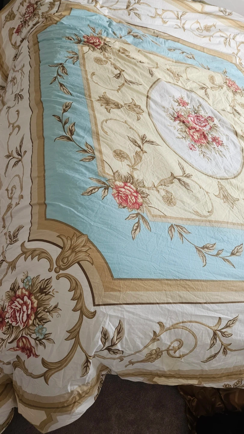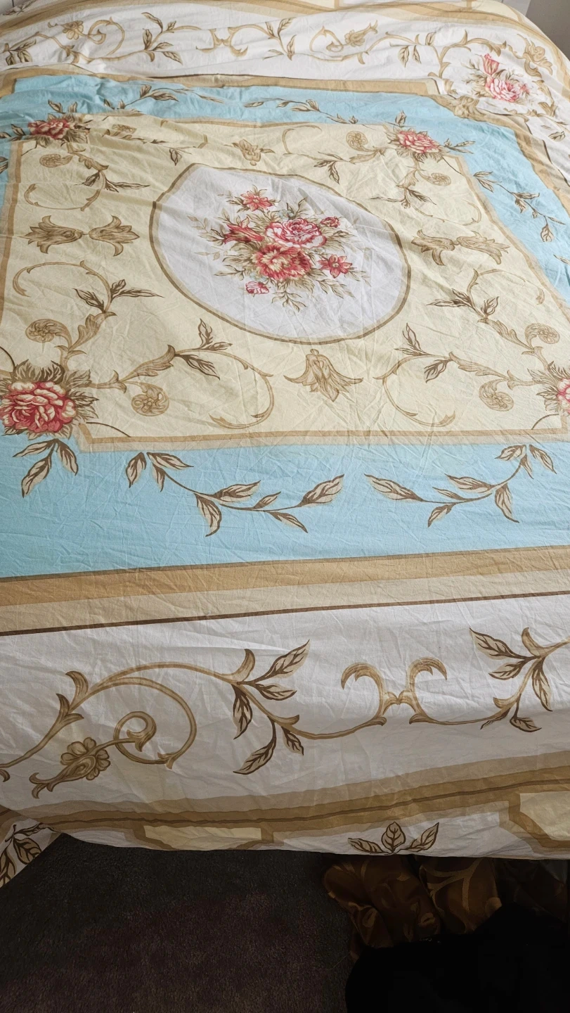 Selling a bedding set with a beautiful floral pattern. It features a mix of white, beige, and light blue colours with a classic floral design. Perfect for adding a touch of elegance to your bedroom!