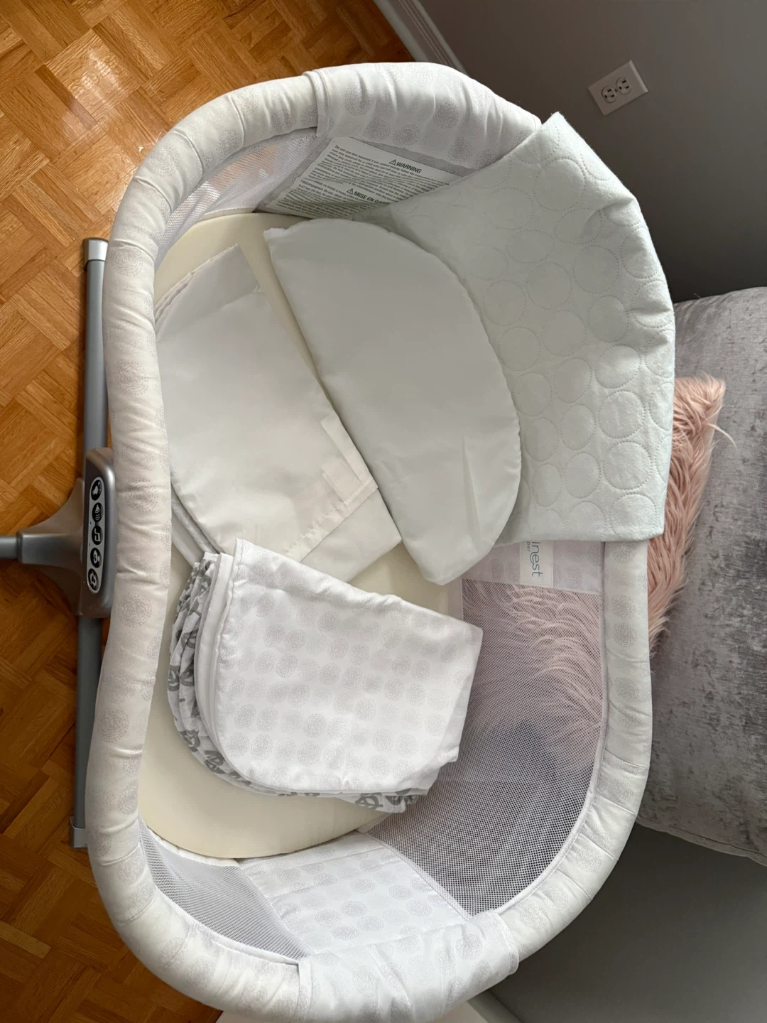 Selling a Halo BassiNest swivel sleeper! It's in great condition and has been well taken care of. It swivels 360 degrees making it easy to keep your little one close. It also has a little light so you can see baby, soothing sounds and vibrations to help your baby sleep soundly. Halo bassinet comes with two mattress protectors and 3 sheets.