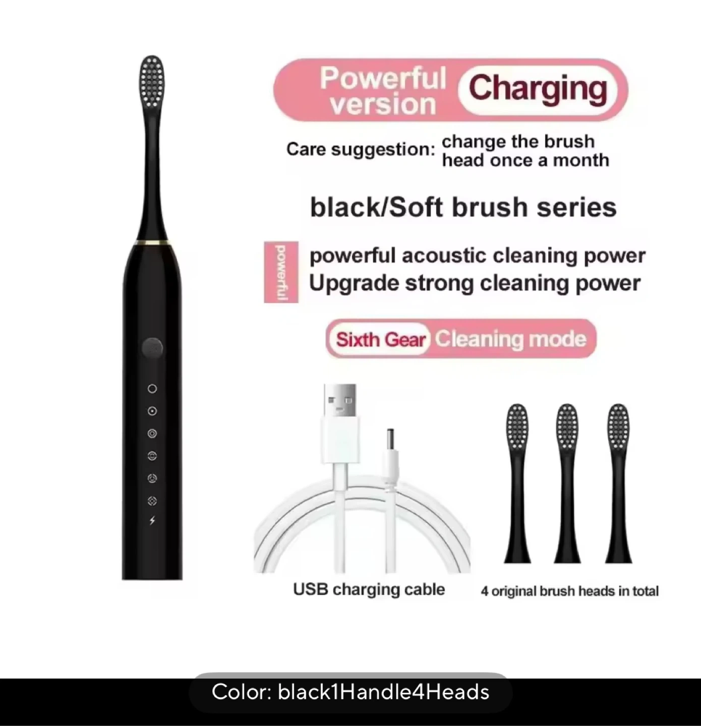 Selling a black electric toothbrush with soft brush series. It features powerful acoustic cleaning and has an upgrade for strong cleaning power. It also has a sixth gear cleaning mode. Comes with a USB charging cable and 4 original brush heads in total