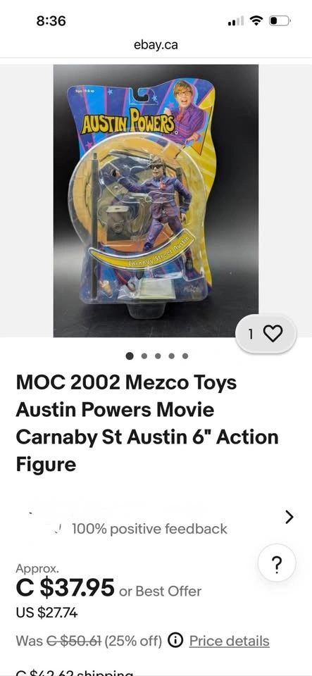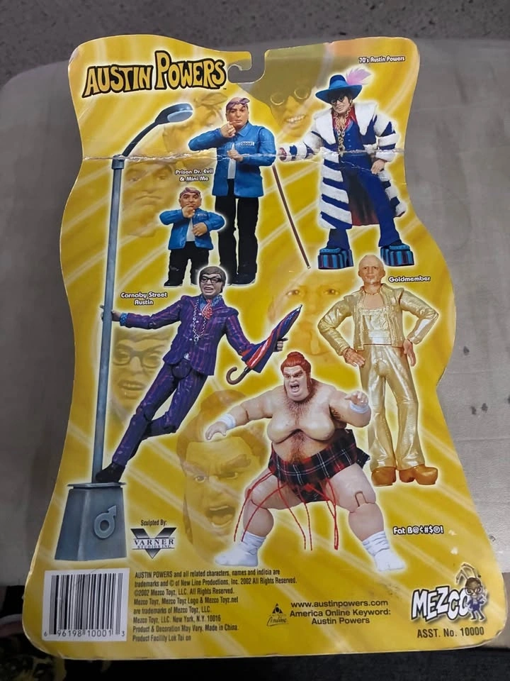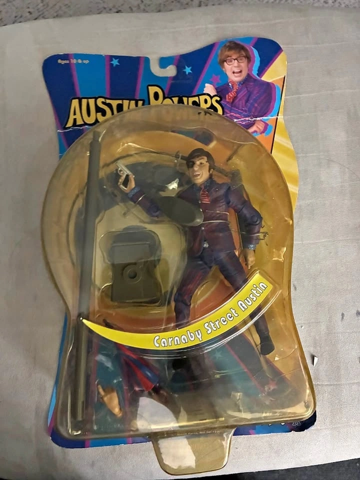 This is a Mezco Toys Austin Powers Carnaby Street Austin action figure. The figure is based on the movie Austin Powers in Goldmember. It stands about 6 inches tall. Accessories include a lamp post, umbrella, and a handgun. The item was manufactured in 2002. Card is damaged and Austin’s glasses are broken. Please look at photos. Item sells for over $35 on line MOC so this is less then half price but still on card.