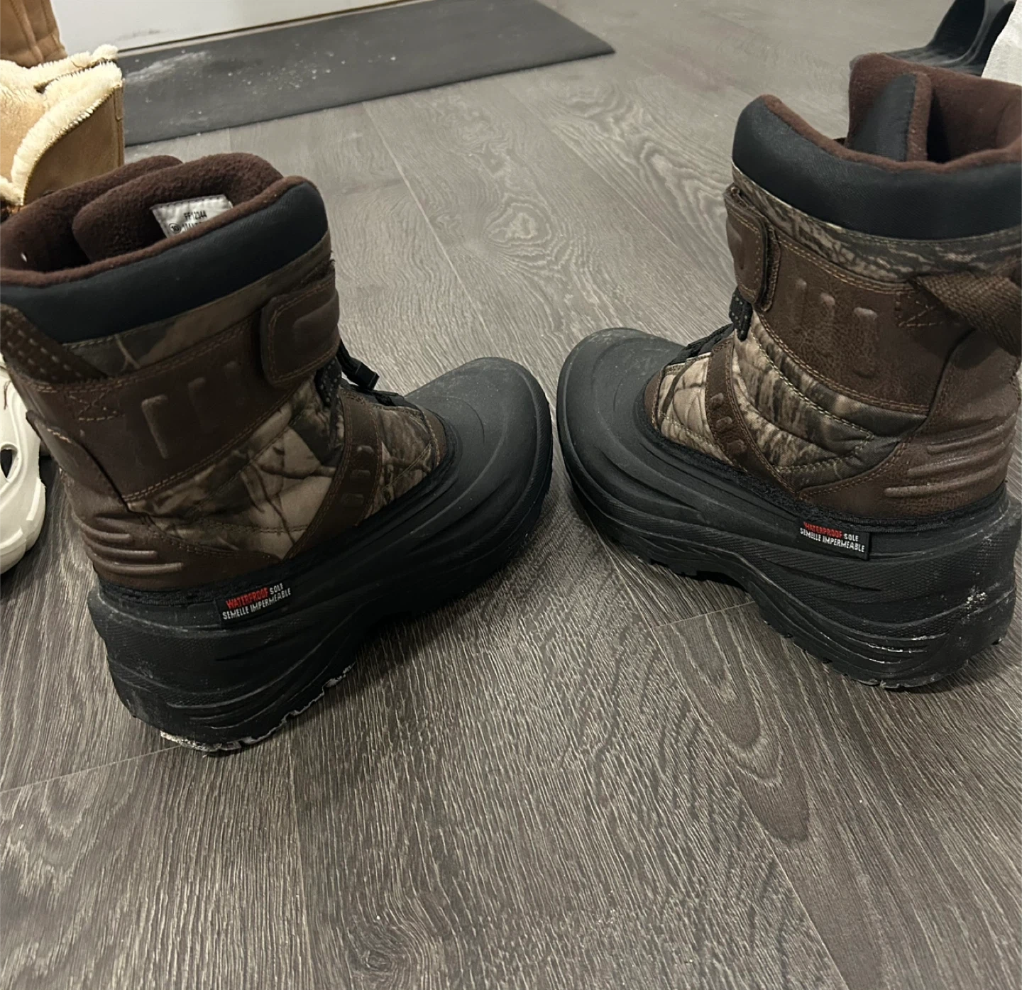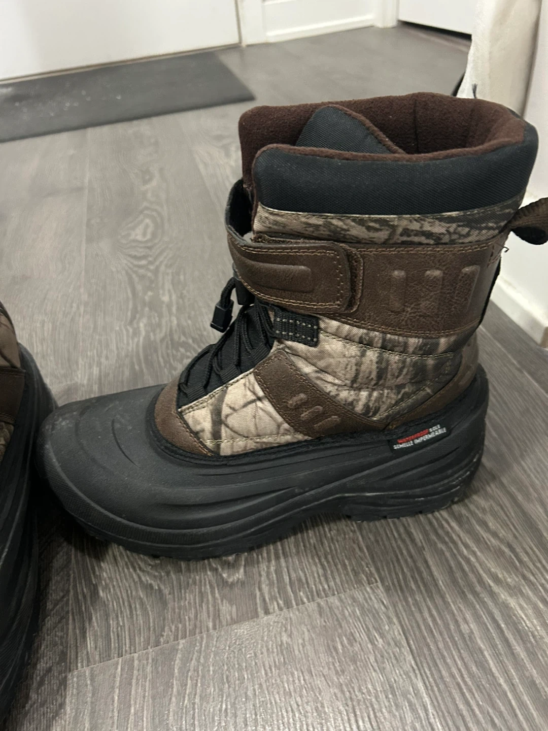 These Ice Fields winter boots feature a camouflage design and are waterproof. They have a warm insulation for cold weather. Size is 10.