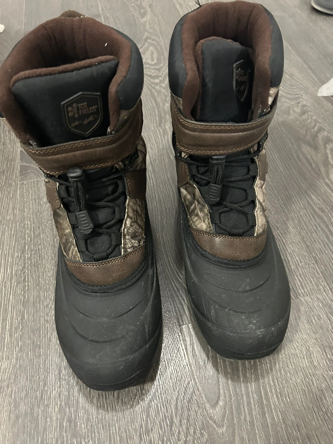 These Ice Fields winter boots feature a camouflage design and are waterproof. They have a warm insulation for cold weather. Size is 10.