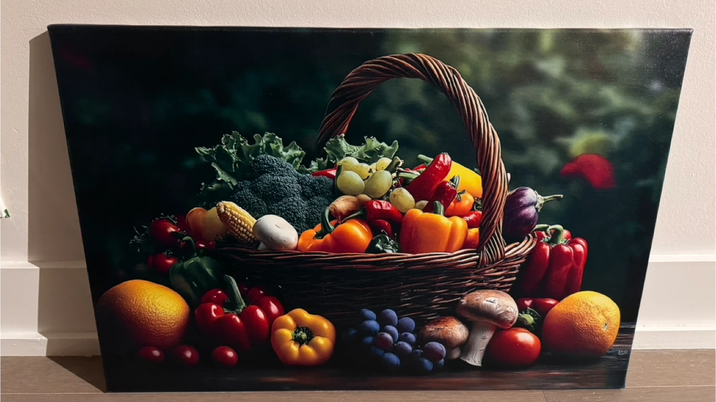 Canvas print featuring a vibrant still life of a fruit and vegetable basket. Dimensions are 16 inches by 24 inches. Ready to hang with built-in hardware.