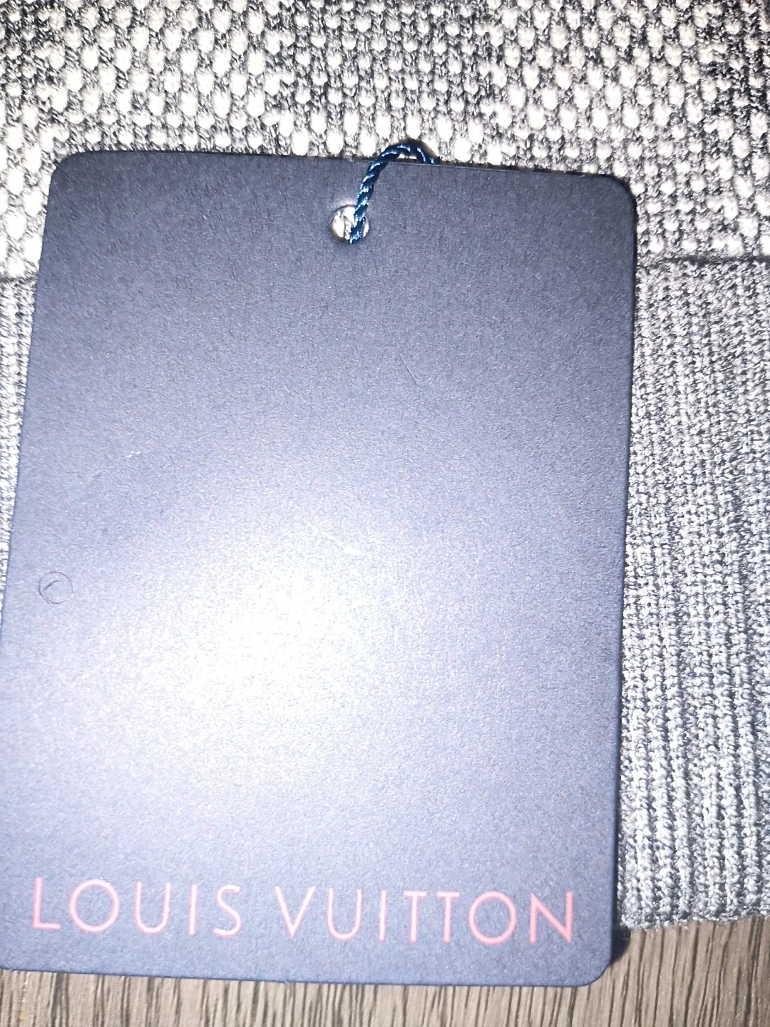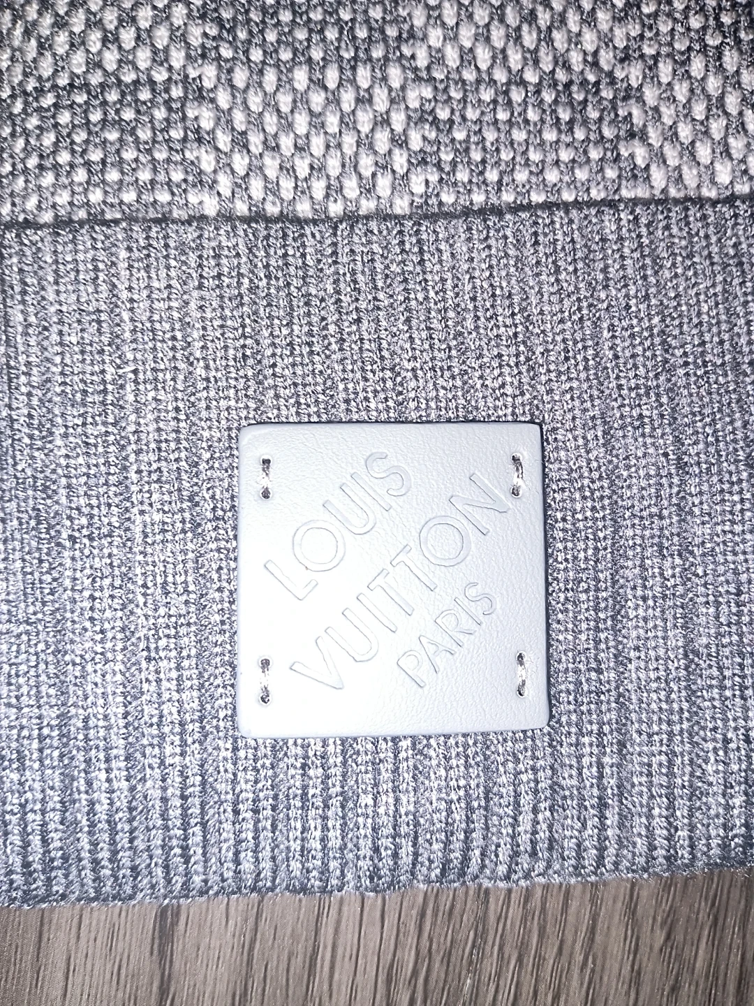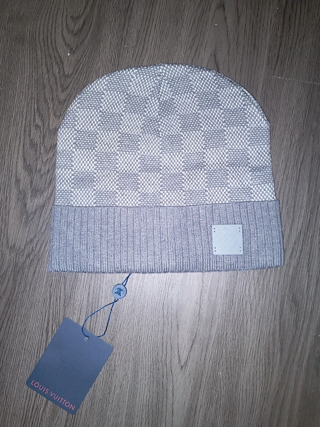 Louis Vuitton knit beanie. Grey checkered pattern with a ribbed grey band. Features embossed leather Louis Vuitton Paris patch.